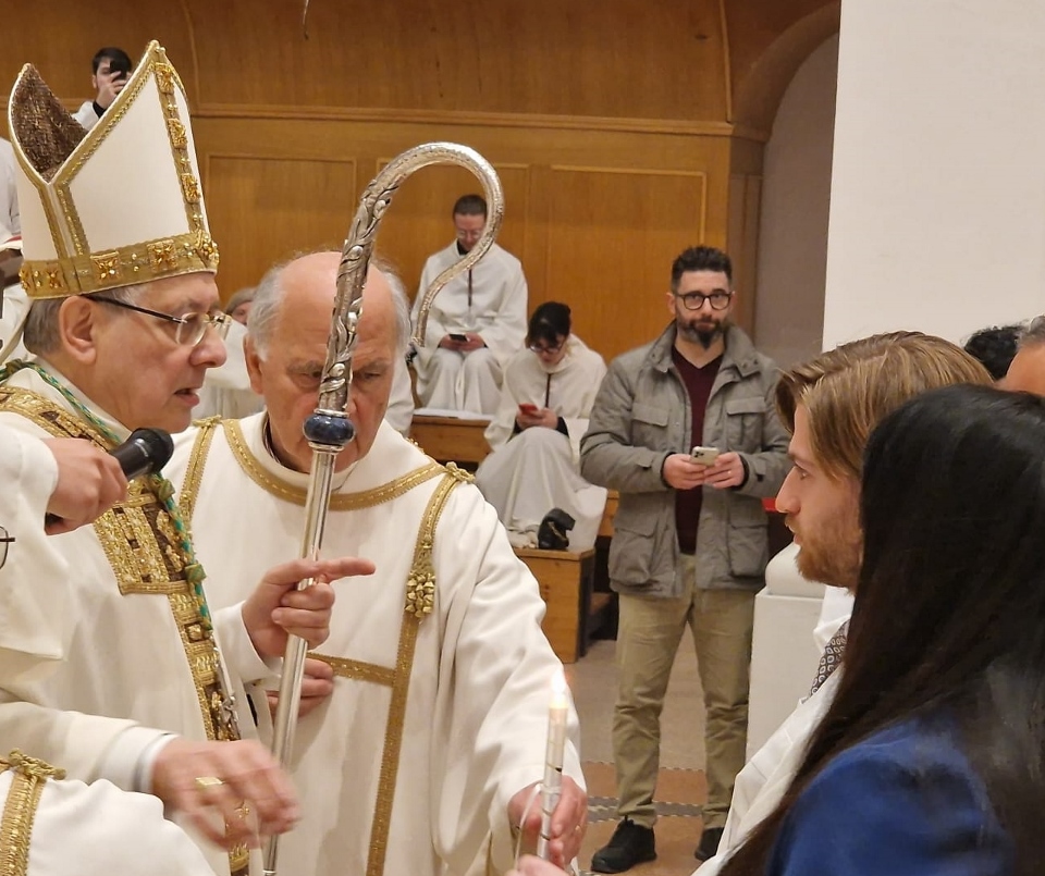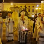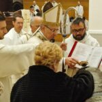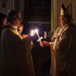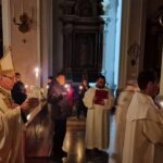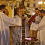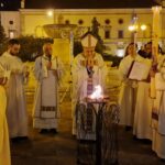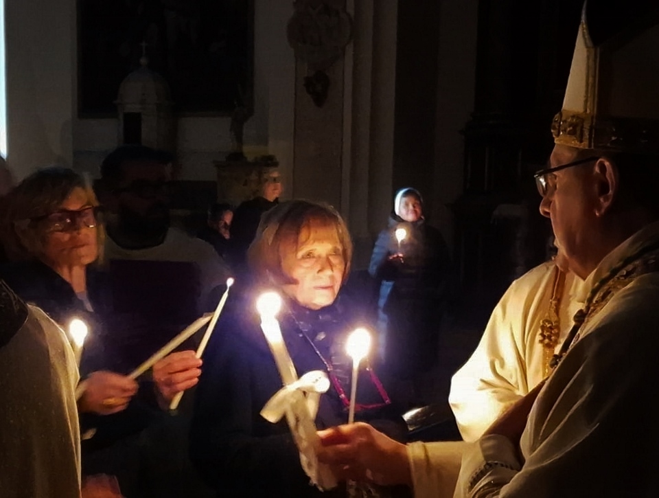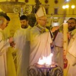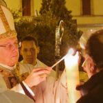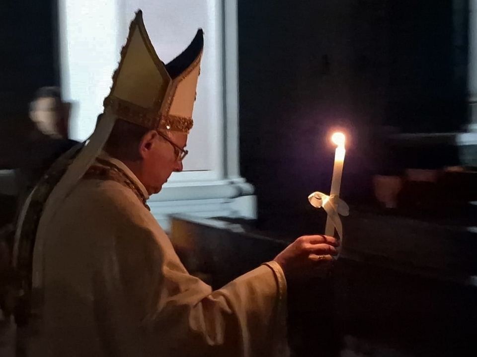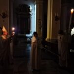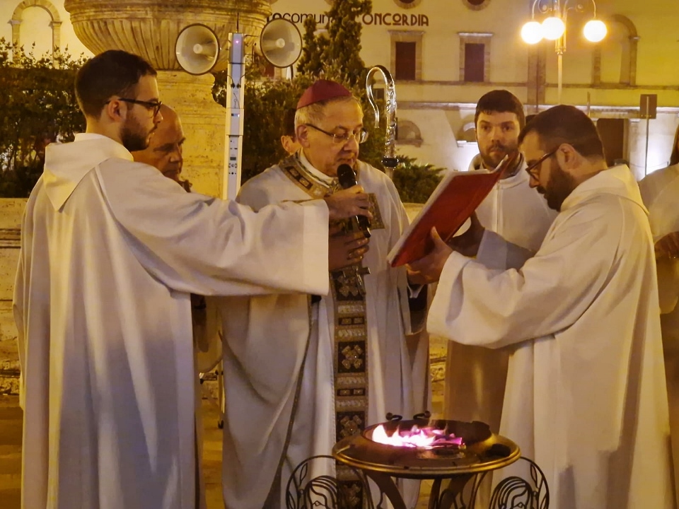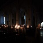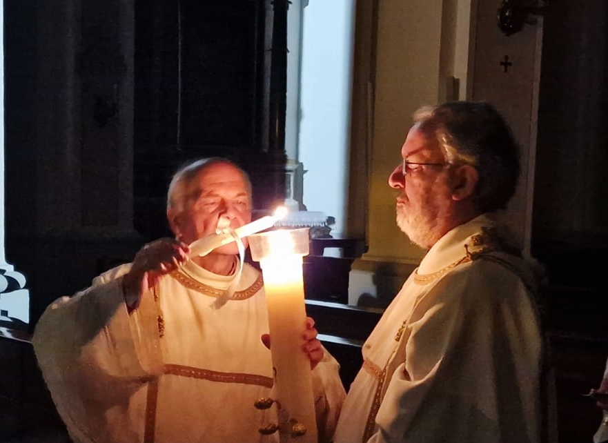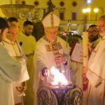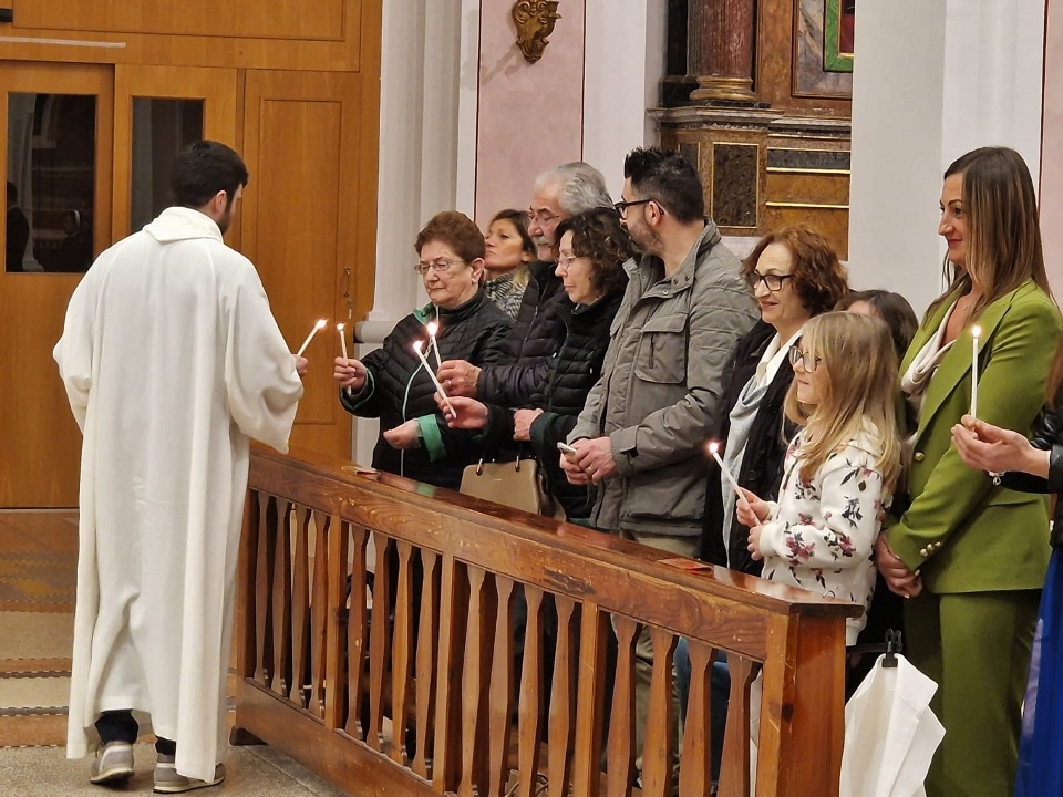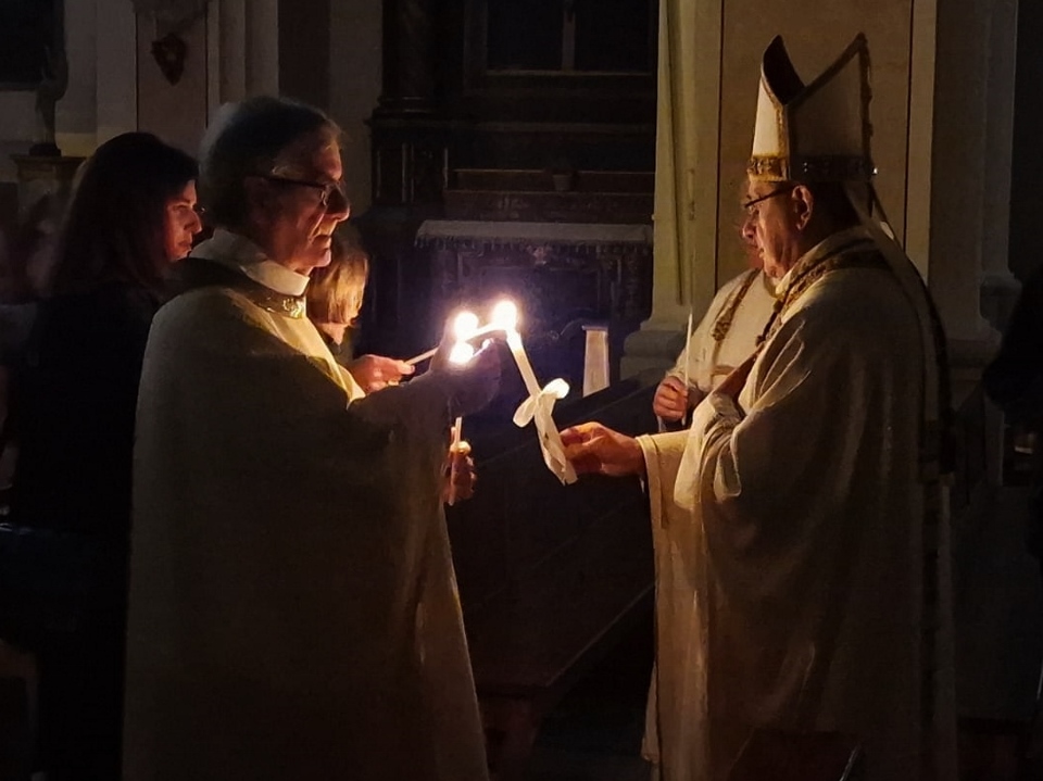 Nella piazza il Vescovo Carlo ha benedetto il fuoco e ha acceso il cero pasquale. Entrati in chiesa, i fedeli, partendo dal vescovo, hanno acceso le candele cantando per tre volte “Luce di Cristo, rendiamo grazie a Dio”. Una volta accese tutte le luci della chiesa, il diacono Walter Gandolfi ha proclamato l’Exultet, antichissimo inno scritto da Sant’Agostino.