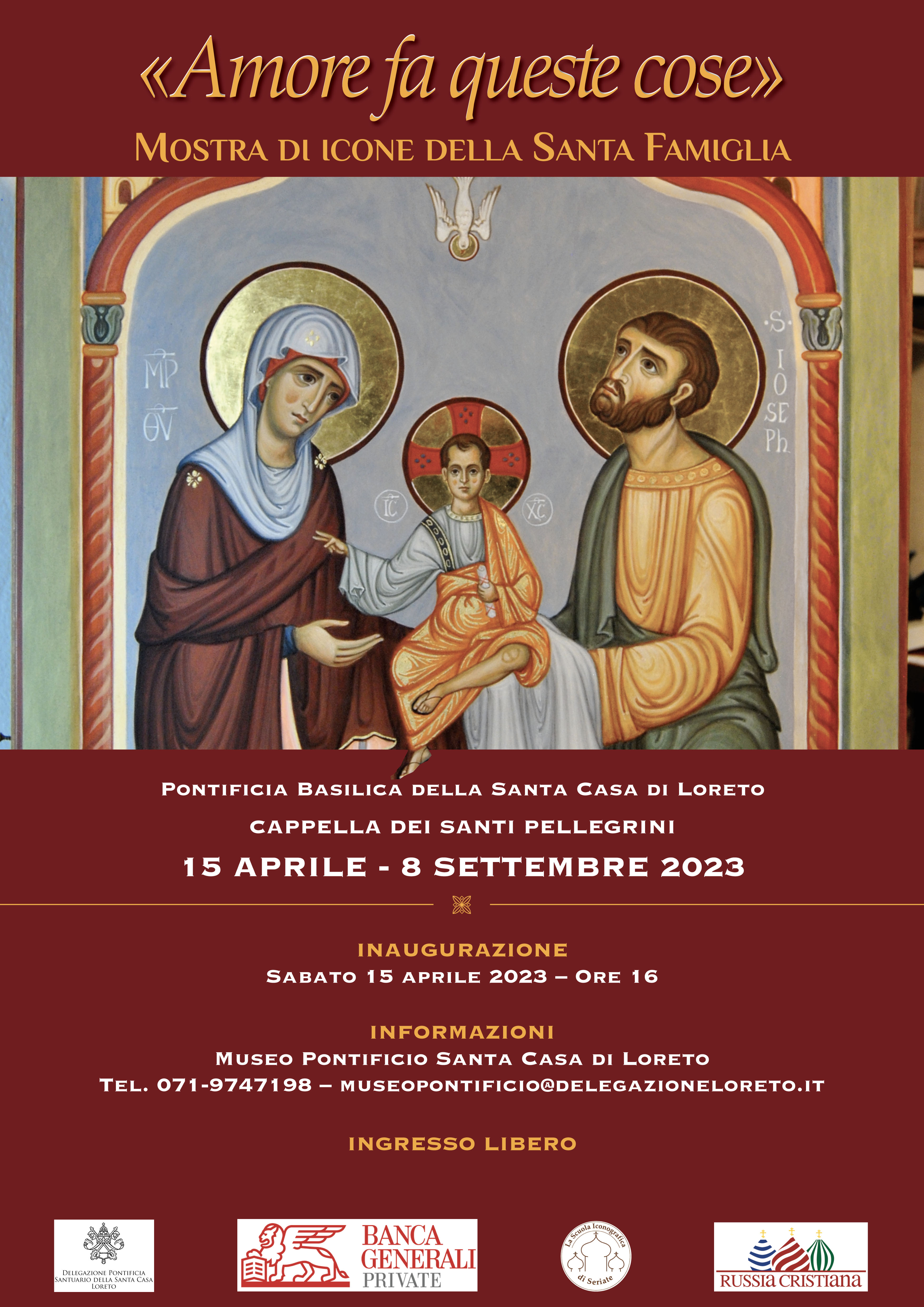LORETO – La Delegazione Pontificia è lieta di annunciare che sabato 15 aprile alle ore 16.00 sarà inaugurata e aperta al pubblico presso la Cappella dei Santi Pellegrini la mostra dal titolo “Amore fa queste cose”, proposte per un’iconografia della Santa Famiglia, a cura della Scuola Iconografica di Seriate in collaborazione con il Museo Pontificio Santa Casa e la Fondazione Russia Cristiana e con il contributo di Banca Generali Private.