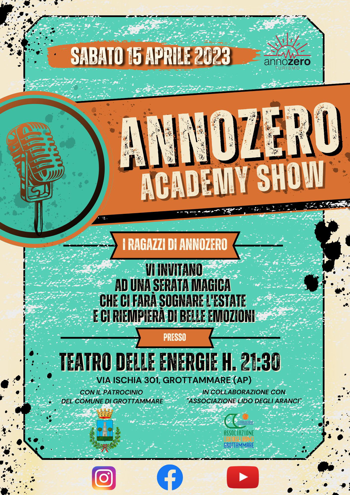 GROTTAMMARE – Sabato 15 Aprile alle ore 21:30 al Teatro delle Energie di Grottammare grande spettacolo di animazione, con musica, ballo, cabaret e tanto altro a cura dell’ “ANNOZERO Turismo”, Azienda italiana leader nel campo dell’animazione turistica. In scena sarà portato lo scoppiettante spettacolo “ANNOZERO ACADEMY SHOW”, costruito sull’arte animatoria con circa 100 ragazzi provenienti da tutta Italia.