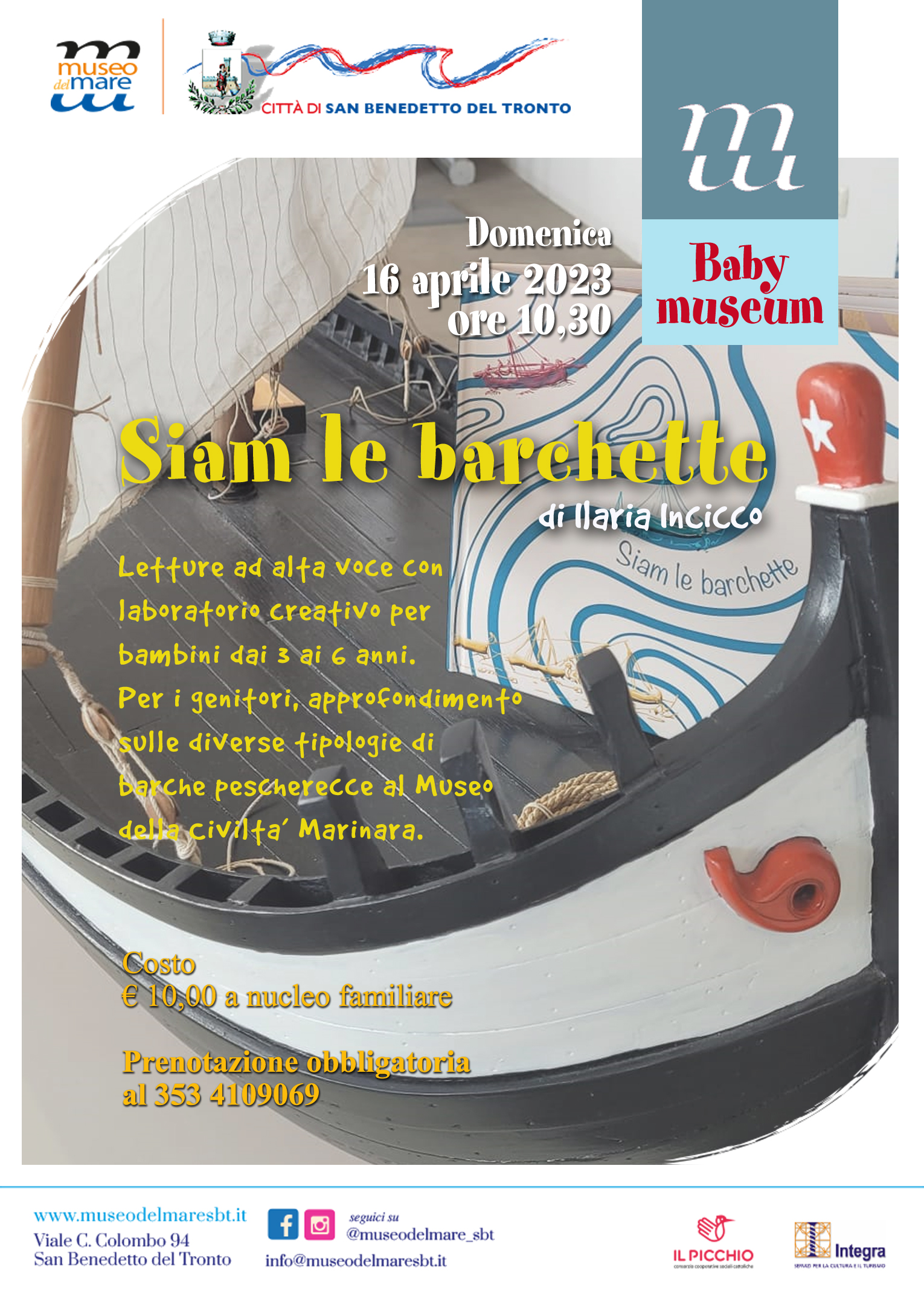 SAN BENEDETTO DEL TRONTO – Si terrà Domenica 16 aprile 2023, alle ore 10:30, presso il Museo del Mare di San Benedetto del Tronto, un’attività didattica per famiglie dal titolo “Siam le barchette – Baby Museum”. Lo spettacolo, curato da Ilaria Incicco, consisterà nella lettura ad alta voce e in un laboratorio creativo per bambini dai 3 ai 6 anni. Per i genitori, approfondimento sulle diverse tipologie di barche pescherecce presso il Museo della Civiltà Marinara delle Marche.