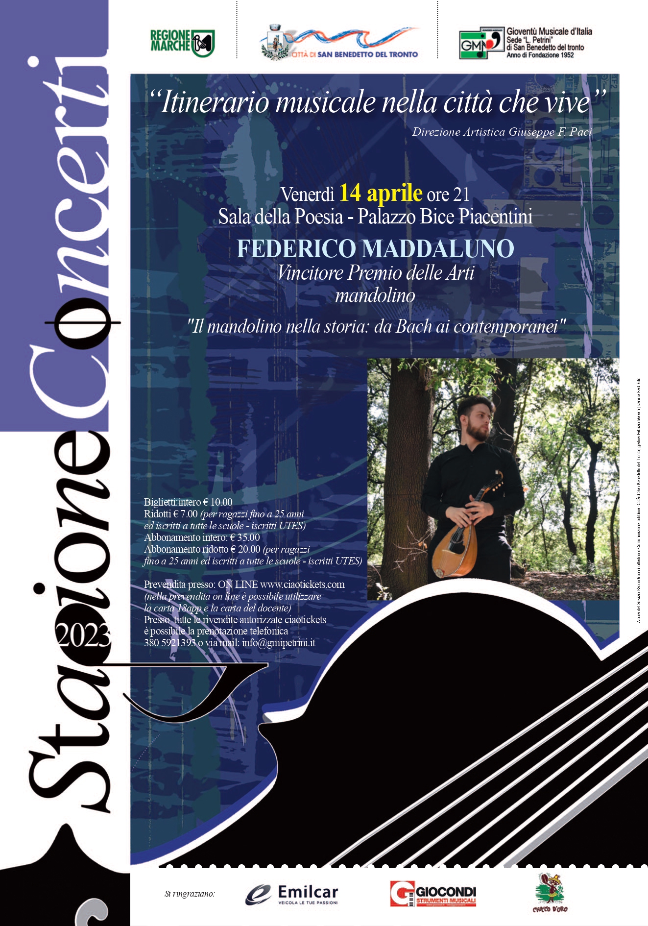 SAN BENEDETTO DEL TRONTO – Sarà la Sala della Poesia di Palazzo Piacentini ad accogliere oggi, venerdì 14 aprile, con inizio alle ore 21:00, il nuovo appuntamento con la Stagione dei Concerti 2023 realizzata dalla Città di San Benedetto del Tronto Assessorato alla Cultura e dalla Gioventù Musicale d’Italia.