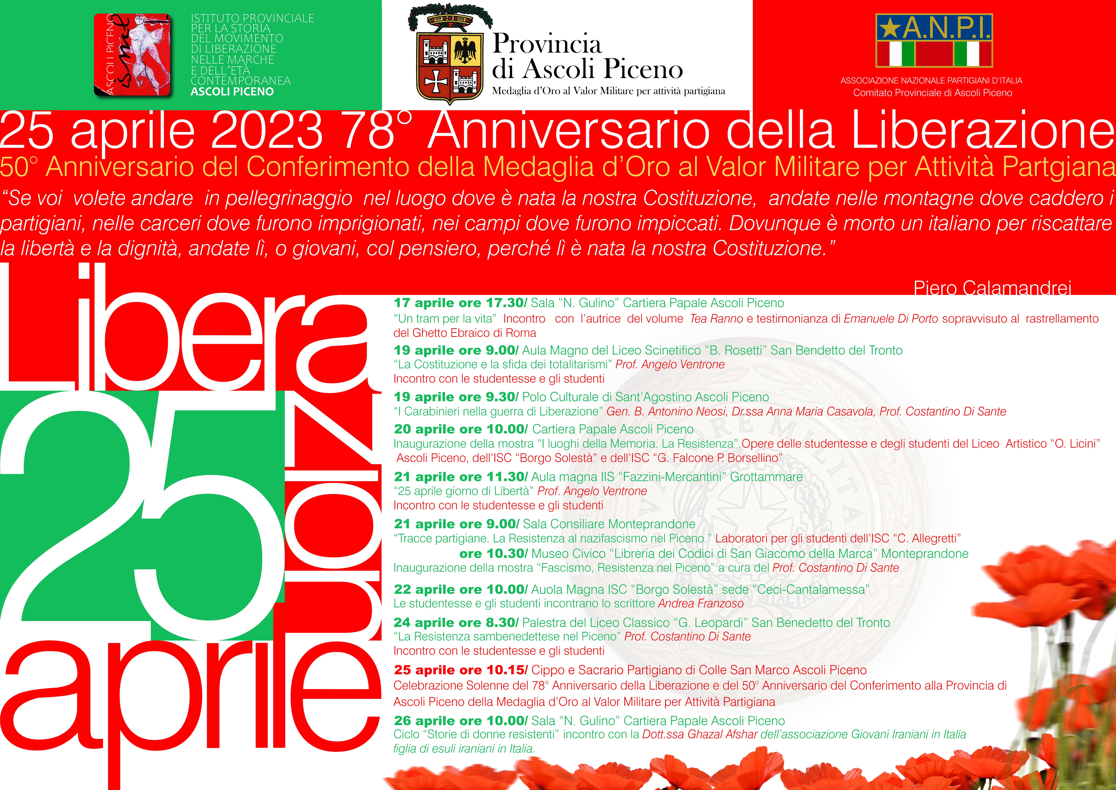 Venerdì 21 Aprile, alle ore 9.00 nella sala Consiliare di Monteprandone si svolgerà il laboratorio per gli studenti della Scuola Secondaria di Primo Grado “Carlo Allegretti” “Tracce partigiane. La Resistenza al nazifascismo nel Piceno. A seguire, alle ore 10.30, nel Museo Civico “Libreria dei Codici San Giacomo della Marca”, verrà inaugurata la mostra: “Fascismo Resistenza nel Piceno” a cura del Prof. Costantino Di Sante. Sempre nella giornata di venerdì 21 Aprile a Grottammare, nell’aula magna dell’Istituto Superiore Fazzini – Mercantini alle ore 11.30 il Prof. Angelo Ventrone parlerà con gli studenti sul tema “25 Aprile giorno della Libertà”