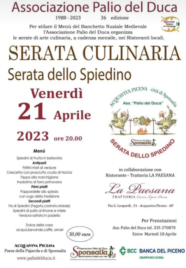 ACQUAVIVA PICENA – Venerdì 21 aprile alle ore 20:00, presso il ristorante “La paesana” di Acquaviva Picena verrà presentata la “Serata dello spiedino”, organizzata dall’Ente Associazione Palio del Duca APS, presidente cav. Nello Gaetani. Lo spiedino, come tecnica di cottura, è conosciuto fin dai tempi più remoti, in modo particolare nel Medioevo si usava per la cottura della selvaggina di “piccola penna”. Gli spiedini, bastoncini di legno, erano di varia lunghezza e venivano scelti in base alla quantità di carne che si intendeva cuocere. Nel tardo Medioevo, la cottura allo spiedo, era la tecnica privilegiata. Le serate culinarie vengono organizzate per realizzare il menù del Banchetto Nuziale medievale che si svolgerà domenica 6 agosto all’interno della Fortezza acquavivana. Il Banchetto, evento unico del Piceno, concluderà la Rievocazione Storica “Sponsalia”, “Patrimonio immateriale” di Acquaviva Picena. “Sponsalia” rievoca il matrimonio stipulato nell’a.D. 1234 ad Acquaviva Picena tra Forasteria e Rinaldo, le famiglie Acquaviva e Brunforte con una politica matrimoniale rafforzarono il potere degli Hohenstaufen nel centro Italia. La famiglia Acquaviva scese in Italia al seguito di Carlo Magno, provenivano dalla Germania ed appartenevano alla nobiltà tedesca, erano Duchi di Baviera, il padre di Forasteria era infatti il Duca Rainaldo. Il cognome Acquaviva iniziò ad essere utilizzato dalla famiglia in questione, dopo essere diventati signori del Castello di Acquaviva Picena, castello già esistente prima dell’anno mille e citato nei documenti delle proprietà dell’Abbazia di Farfa nell’anno 947 d.C. Il territorio di Acquaviva Picena e quello circostante fu donato al Duca Rainaldo dall’imperatore Enrico VI di Svevia, padre di Federico II. Gli Acquaviva al tempo delle Crociate presero parte ad esse, con proprie milizie e proprie navi. Fu il vescovo Rinaldo degli Acquaviva a celebrare il Rito di incoronazione di Manfredi di Svevia e a causa di questo evento, subì la scomunica papale. I Brunforte, discendenti dei Mainard von Sigfrid di stirpe franco-Sali, la stessa dei Merovingi, scesero in Italia, anch’essi insieme alle milizie di Carlo Magno, provenivano dalla Contea d’Olanda, vivevano infatti sulle sponde del Mar del Nord nel territorio dell’odierna Olanda; il nonno di Rinaldo era il Conte Fidesmino, vicario di Federico II e collaboratore del siniscalco e consigliere imperiale, Markwald von Annweiler. Il cognome Brunforte fu utilizzato per la prima volta da Rinaldo perché stabilì la sua dimora nel territorio vicino Sarnano che prendeva appunto il nome di Brunforte. Il giovane sposo della Rievocazione storica acquavivana, fu conosciuto più tardi come Rinaldo il “Grande” e divenne podestà di Pisa. Alla sua morte su sepolto nella cattedrale di Pisa. Anche alcuni membri della famiglia Brunforte parteciparono alle Crociate.