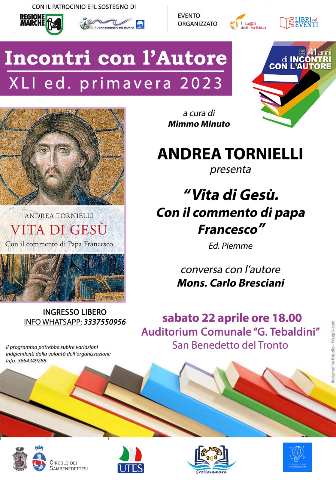SAN BENEDETTO DEL TRONTO – Sabato 22 Aprile alle ore 18.00, presso l’Auditorium Comunale “G. Tebaldini” di San Benedetto del Tronto, Andrea Tornielli presenterà il libro “ Vita di Gesù. Con il commento di Papa Francesco”.