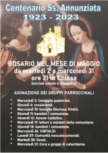 “Quest’anno il mese di maggio è particolarmente significativo in quanto la nostra parrocchia festeggia una speciale ricorrenza – dichiara il parroco don Alfredo –. Domani 3 maggio, in particolare, giorno del centesimo anniversario della consacrazione della nostra chiesa alla Santissima Annunziata, verrà celebrata una Santa Messa, alle ore 18:30, presieduta dal confratello don Dino Pirri che lo stesso giorno ricorda il venticinquesimo anniversario della sua prima Messa“.