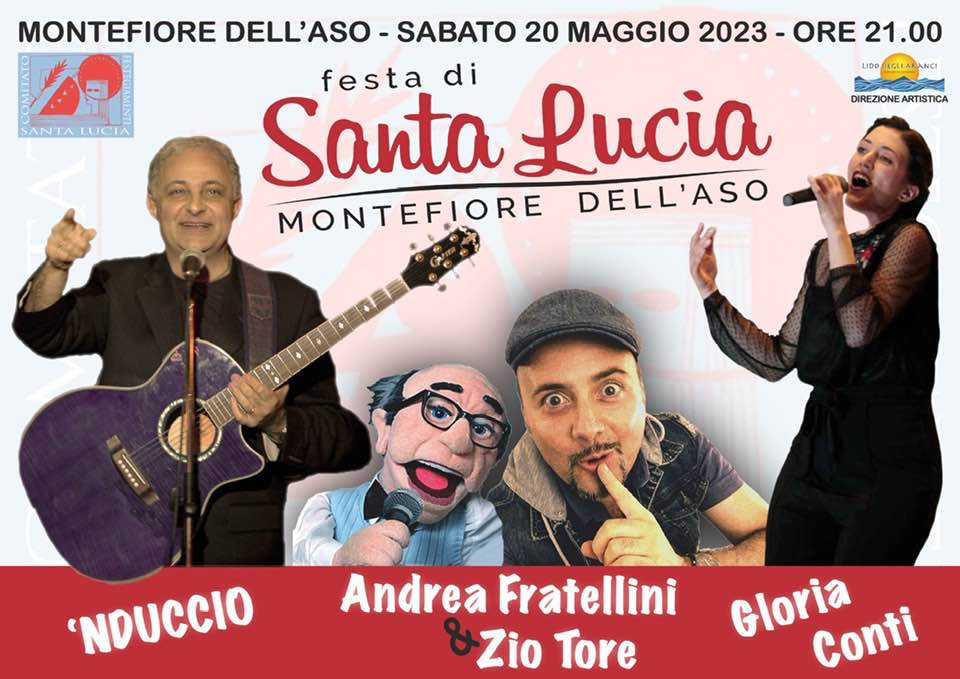 Dopo i successi al Teatro Mercantini di Ripatransone e al Teatro di Monte Vidon Corrado, c’è grande attesa per il primo appuntamento della stagione estiva 2023 a Montefiore dell’Aso il 20 maggio per la festa di Santa Lucia, con la performer Gloria Conti alla conduzione e agli intermezzi musicali, il mitico ‘Nduccio alle battute e il più bravo ventriloquo d’Italia Andrea Fratellini vincitore di Italia’s Got Talent edizione 2020.