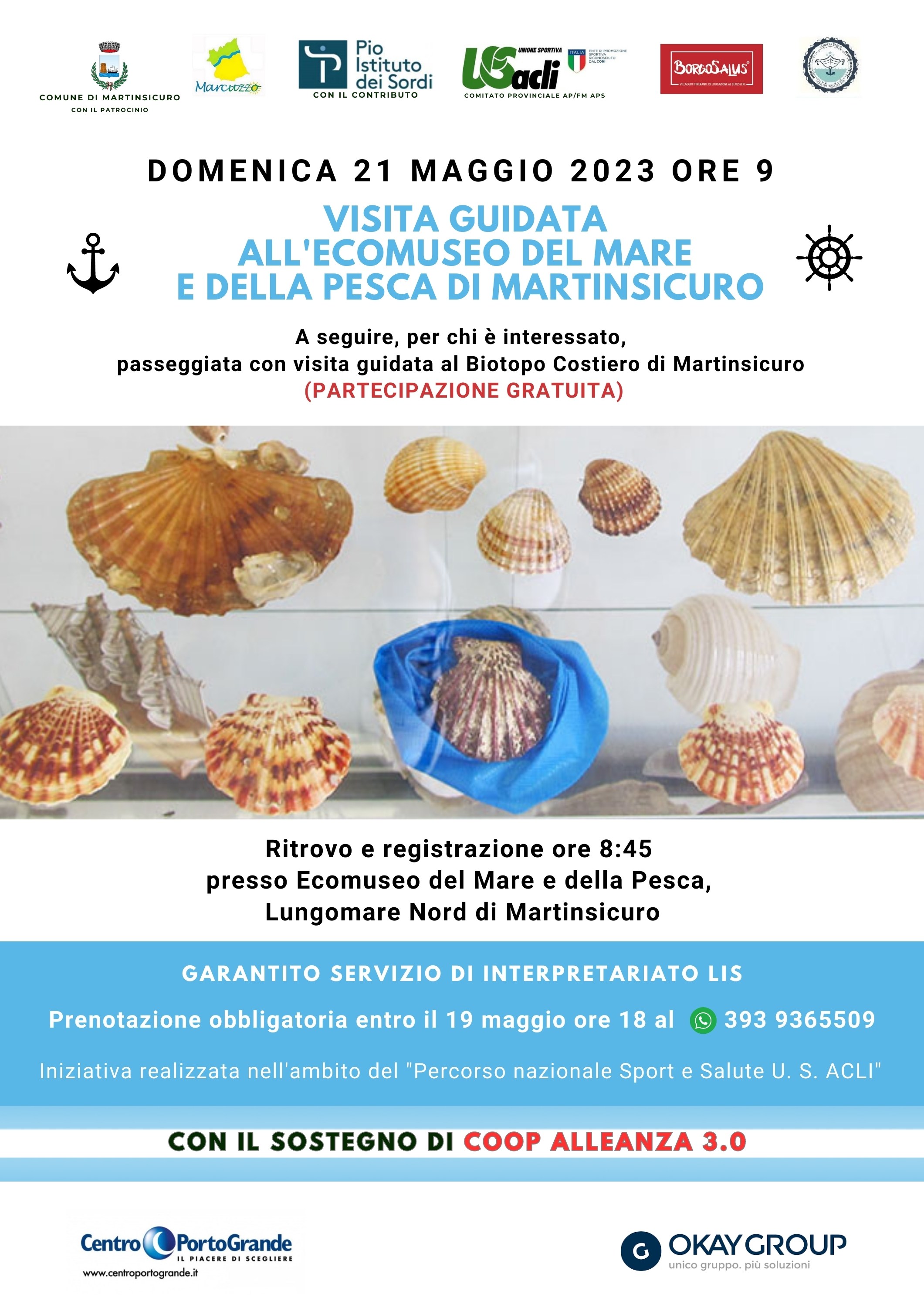 MARTINSICURO – Domenica 21 maggio si svolgerà una visita guidata gratuita all’Ecomuseo del Mare e della Pesca di Martinsicuro. L’iniziativa, organizzata da U.S. Acli Provinciale e dall’Associazione “Il Marcuzzo”, ha il patrocinio del Comune di Martinsicuro, con il sostegno di Coop Alleanza 3.0, con il contributo del Pio Istituto dei Sordi e con la collaborazione dell’Associazione “Martin Pescatori”, del Centro Commerciale Porto Grande e di Ok Group. L’iniziativa rientra nell’ambito del progetto “Borgosalus – Percorso nazionale Sport e Salute U.S. Acli”.
