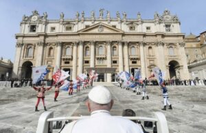 Prima di compiere l’ultimo tratto dal sagrato della piazza delimitata dal colonnato del Bernini fino alla sua postazione, Francesco si è congedato dai suoi piccoli ospiti, che si sono goduti il giro tra i vari settori delimitate dalle transenne e presi d’assalto dai fedeli attrezzati per la pioggia con impermeabili e ombrelli.