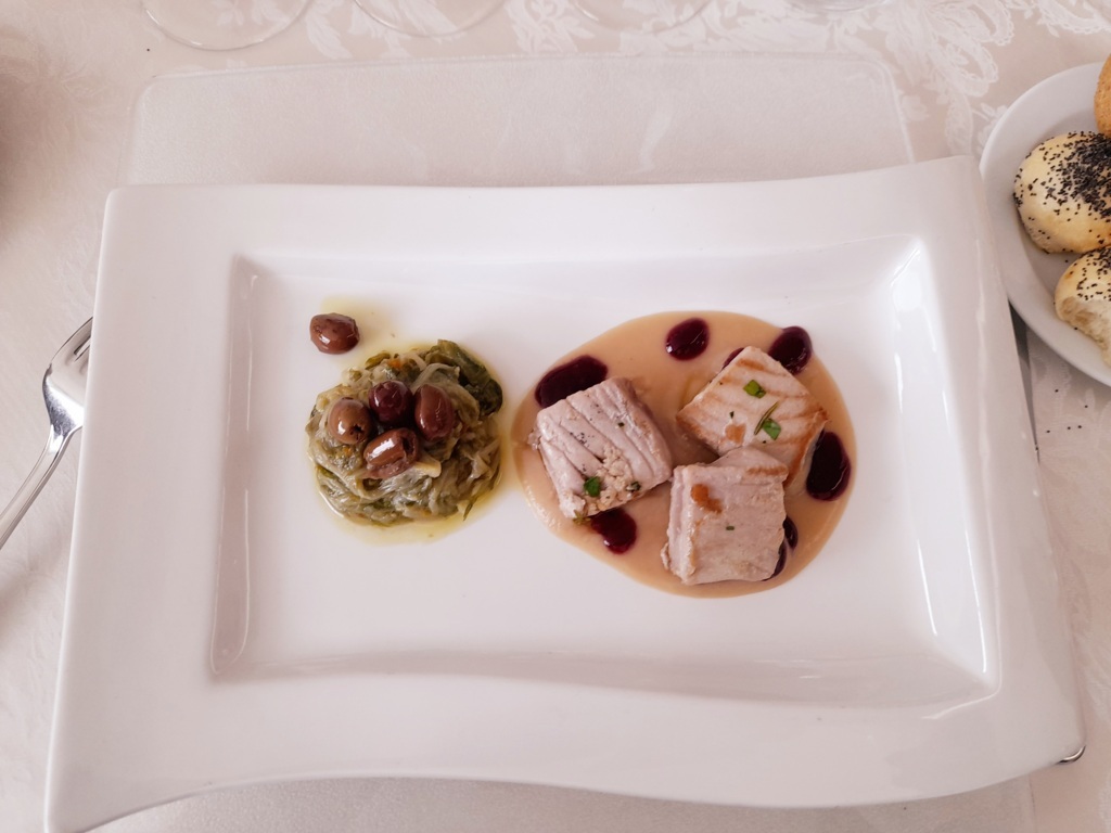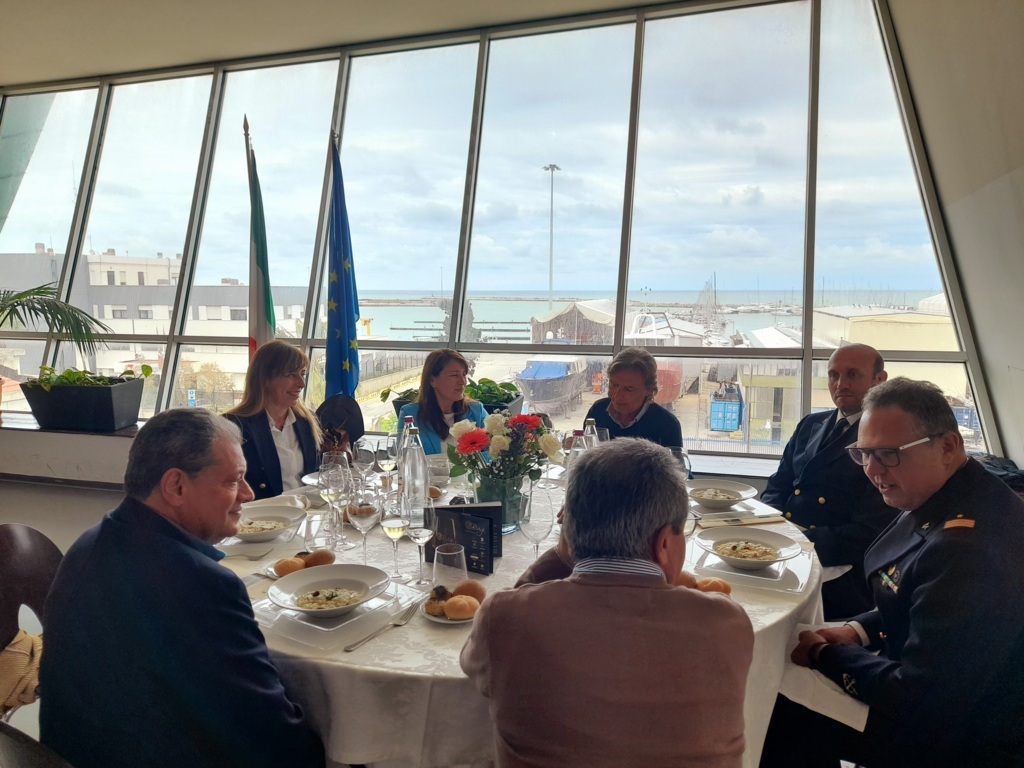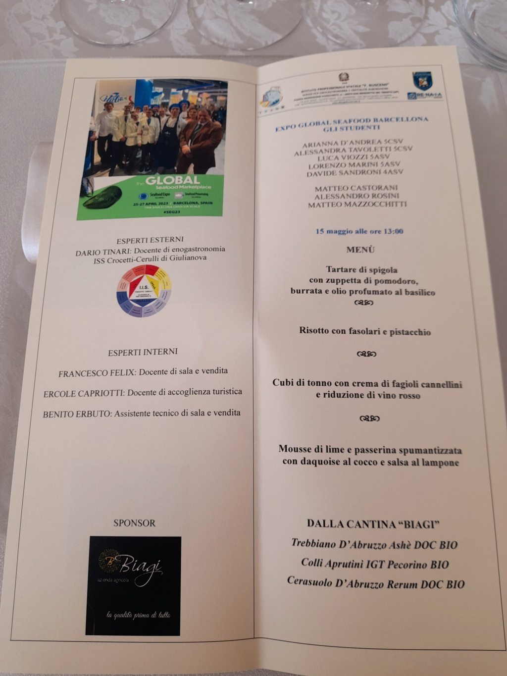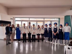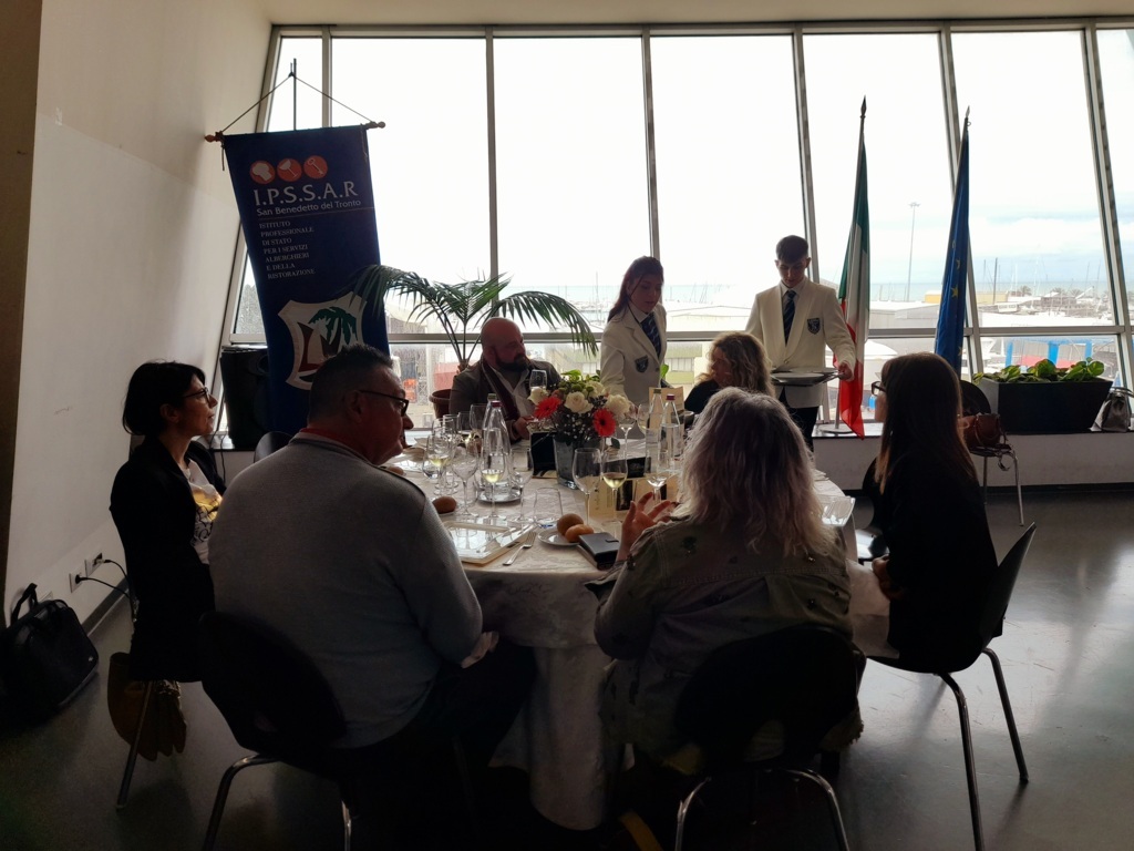 Dalle ore 13:30 alle ore 15:00, infine, presso il Sala Galiè dell’Istituto Buscemi, gli otto studenti relatori, supportati dai Rappresentanti di Istituto, hanno organizzato, per gli ospiti esterni un opening lunch ispirato al tema Seafood, il cui menu ha rispecchiato quello presentato all’Expo Global Barcellona 2023: tartare di spigola con zuppetta di pomodoro, burrata e olio profumato al basilico; risotto con fasolari e pistacchio; cubi di tonno con crema di fagioli cannellini e riduzione di vino rosso; mousse di lime e passerina spumantizzata con dacquoise al cocco e salsa al lampone. I prelibati piatti sono stati accompagnati dai vini pregiati della Cantina Biagi: Trebbiano d’Abruzzo Ashè DOC BIO, Colli Aprutini IGT Pecorino BIO, Cerasuolo d’Abruzzo Rerum DOC BIO.