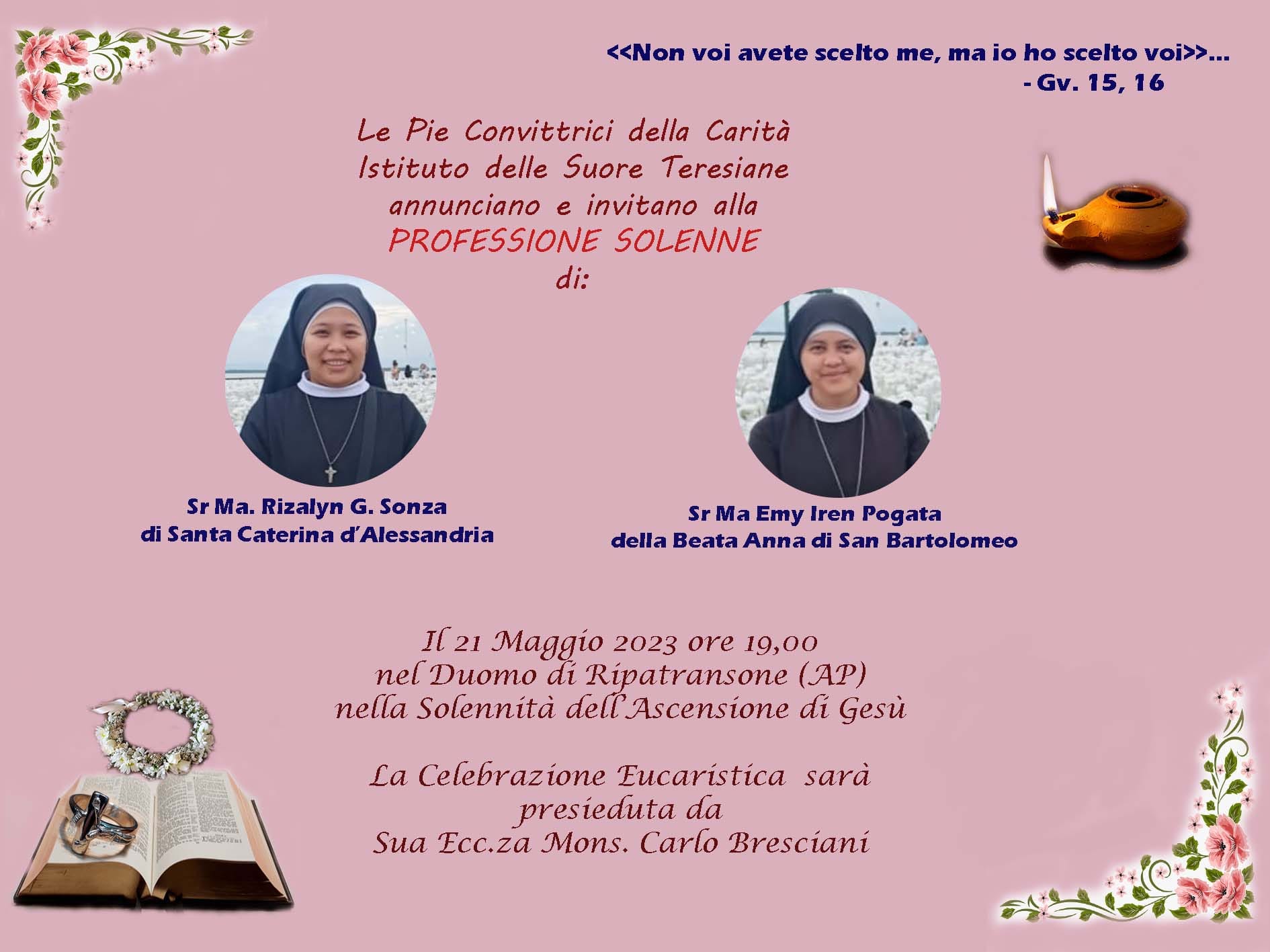 RIPATRANSONE – Sarà un giorno importante quello di domani, Domenica 21 Maggio, per l’Istituto delle Suore Teresiane di Ripatransone: le Pie Convettrici della Carità, infatti, hanno annunciato ai fedeli la professione perpetua di Suor Ma. Rizalyn G. Sonza di Santa Caterina d’Alessandria e di Suor Ma. Emy Iren Pogata della Beata Anna di San Bartolomeo, che si terrà presso il Duomo di Ripatransone alle ore 19:00. La celebrazione eucaristica, che cade nel giorno della solennità dell’Ascensione di Gesù, sarà presieduta da Mons. Carlo Bresciani, vescovo della Diocesi di San Benedetto del Tronto – Ripatransone – Montalto, e sarà concelebrata dal parroco don Nicola Spinozzi.