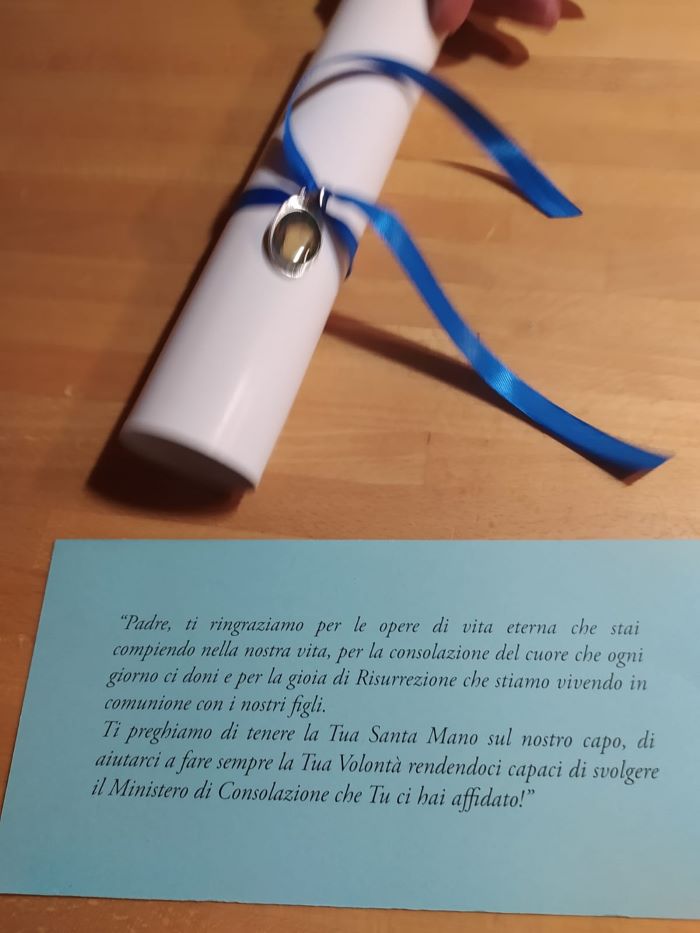 Uno stralcio della riflessione di Andreana Bassanetti, fondatrice dell’Associazione: “Alzate le mani, li benedisse. Mentre li benediceva si staccò da loro e salì in cielo. Gesù parte benedicendo, le sue mani benedicenti sono come un tetto che ci protegge. Quindi anche noi oggi siamo pieni di gioia e di gratitudine perché in quella mano benedicente troviamo le mani benedicenti dei nostri figli saliti in cielo con Lui, loro ci accompagnano, ci proteggono e ci sostengono lungo il nostro faticoso cammino, troviamo l’invito di Gesù ad elevare i nostri cuori alla gioia del cielo in comunione con i nostri amati figli che la stanno già vivendo. Ringraziamo allora Gesù di averci spalancato le porte del Cielo, di permetterci di camminare già qui ed ora uniti strettamente ai nostri figli, nella speranza di rivederli e riabbracciarli nel suo amore e prepariamo il cuore a partecipare alla festa dei Figli in cielo nella nostra comunità”.
