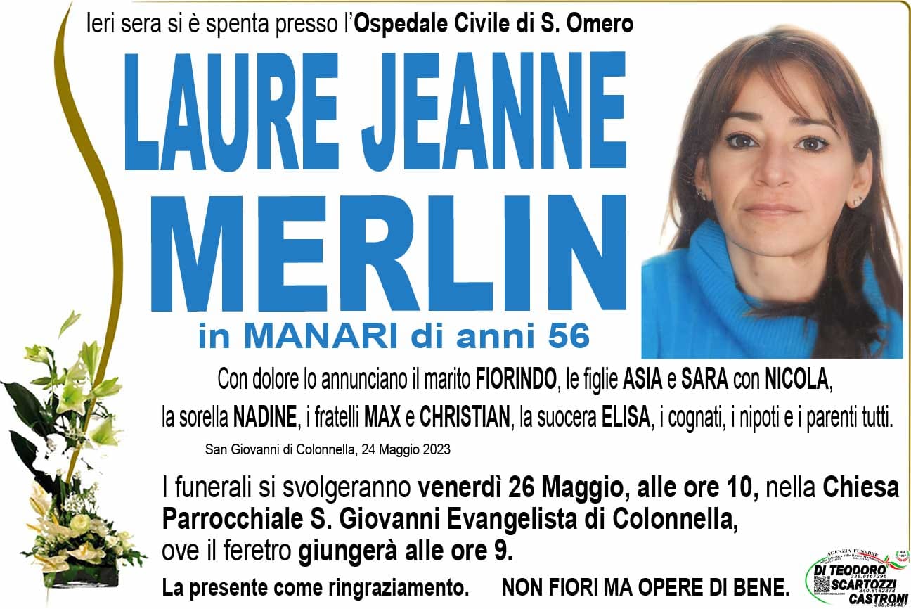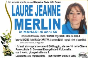 Tutt’altra storia quella della Merlin: di origini francesi – come si intuisce dal nome – Laure Jeanne è venuta in Italia per amore nel lontano giugno del 1990 e precisamente a Colonnella, dove si è costruita una famiglia. Laure Jeanne lascia il marito Fiorindo, la giovanissima figlia Asia, la giovane figlia Sara con Nicola, la sorella Nadine, i fratelli Max e Christian, la suocera Elisa, i cognati, i nipoti e tutti i parenti e gli amici che negli anni l’hanno conosciuta come una persona buona, umile e mite, protagonista di una vita vissuta nell’ombra e in silenzio, molto riservata e sempre sorridente. Malata già da tempo, negli ultimi giorni il suo stato di salute è peggiorato fino ad essere necessario il ricovero presso il Presidio Ospedaliero “Val Vibrata”. Attualmente la salma si trova presso l’Obitorio del nosocomio abruzzese e giungerà presso la chiesa di San Giovanni Evangelista alle ore 9:00 di venerdì 24 maggio, ove, un ‘ora dopo, si terranno i funerali.