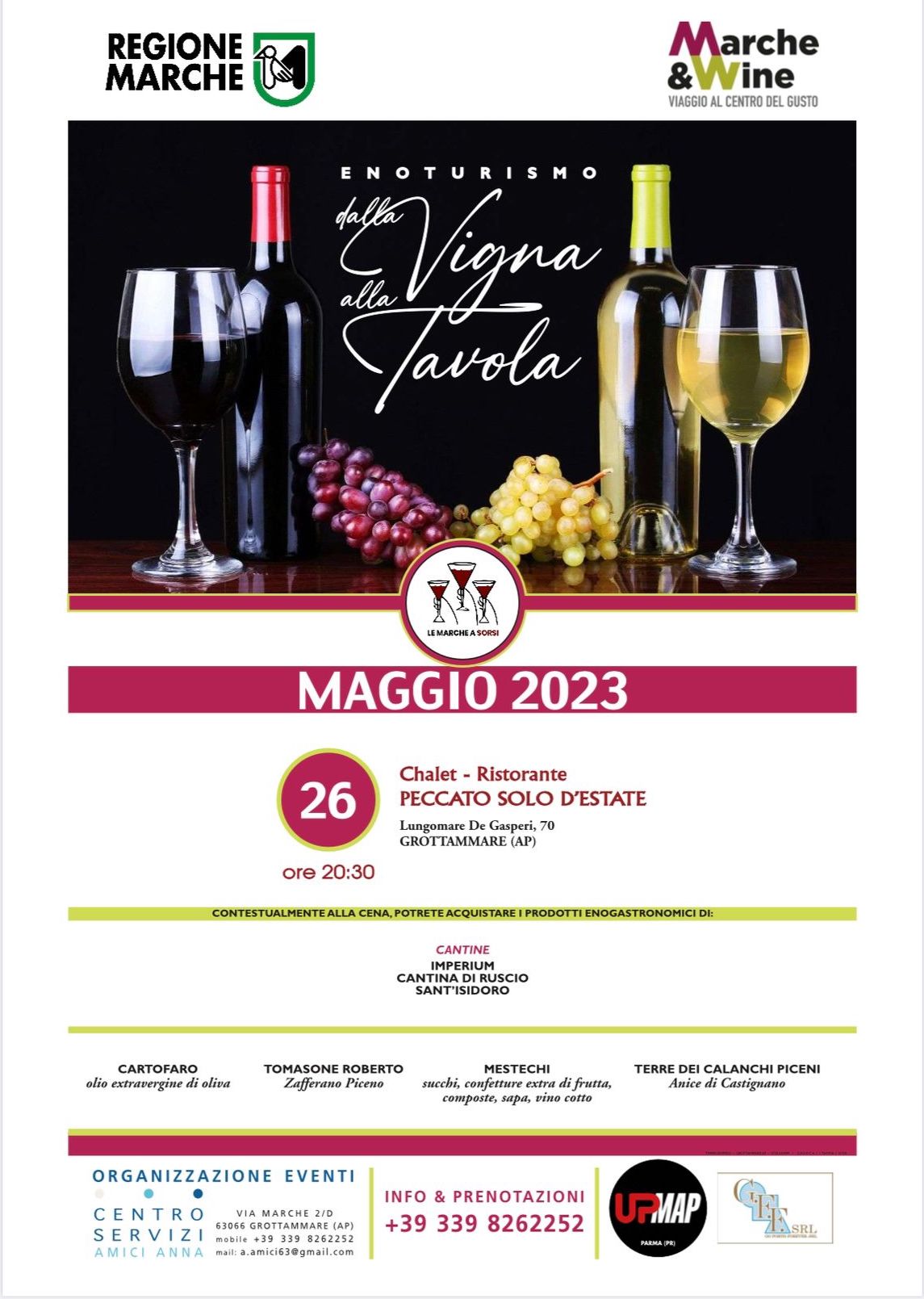 GROTTAMMARE – È in dirittura di arrivo il progetto “Dalla Vigna alla Tavola – Le Marche a sorsi”, realizzato con il contributo dalla Regione Marche – Coordinamento della Comunicazione a cura del Servizio Politiche Agroalimentari. Si svolgerà, infatti, venerdì 26 Maggio, dalle ore 20:30 in poi, a Grottammare, presso lo Chalet Ristorante “Peccato solo d’estate”, la penultima delle dieci serate di valorizzazione enogastronomica e turistica del territorio marchigiano, nate con l’intento di avviare un’azione promozionale specifica per il settore vitivinicolo di qualità, oltre alle produzioni agroalimentari, con il coinvolgimento della ristorazione e degli operatori turistici.