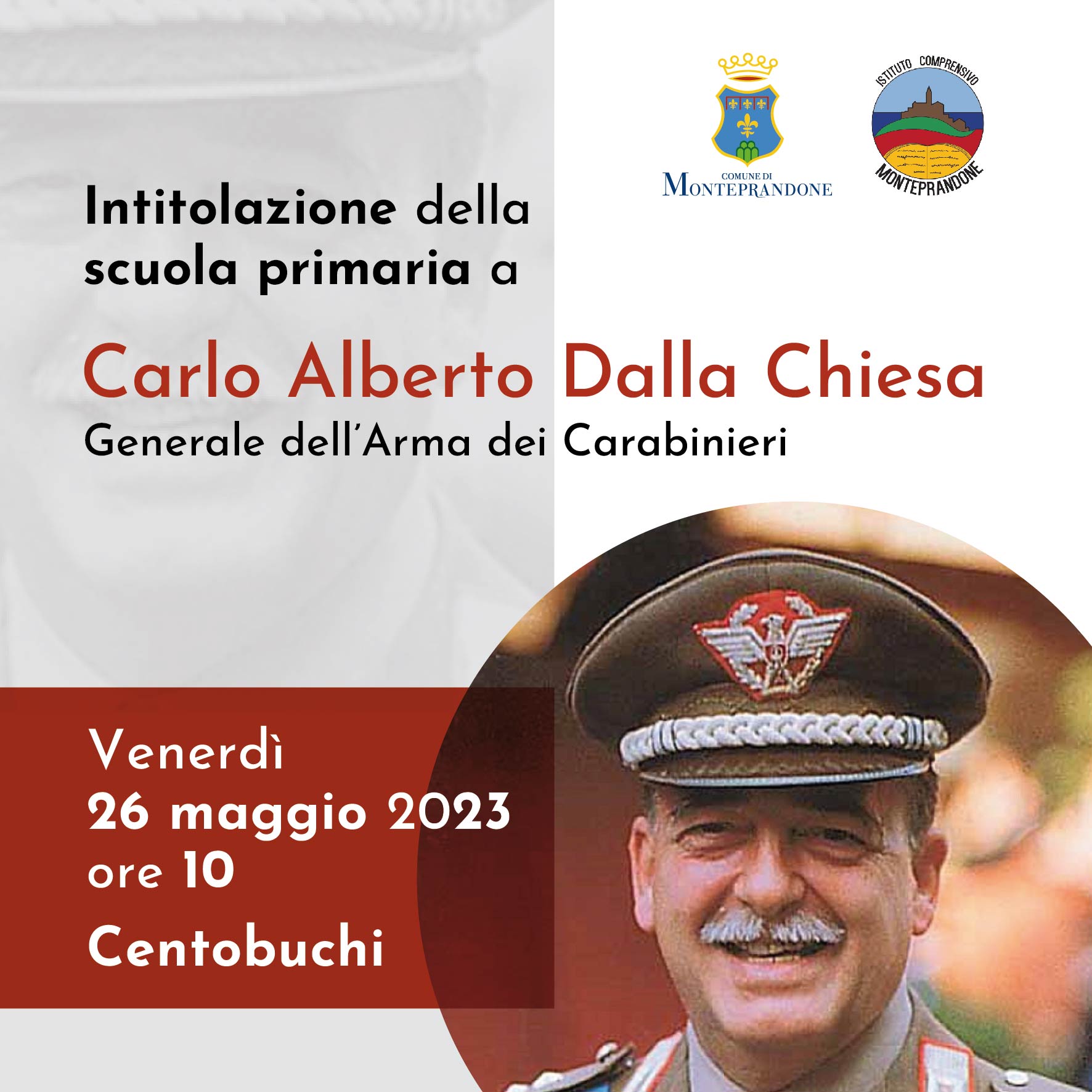 MONTEPRANDONE – La scuola primaria di Centobuchi sarà intitolata al Generale Carlo Alberto Dalla Chiesa. La cerimonia si terrà venerdì 26 maggio, presso il plesso di via Benedetto Croce.