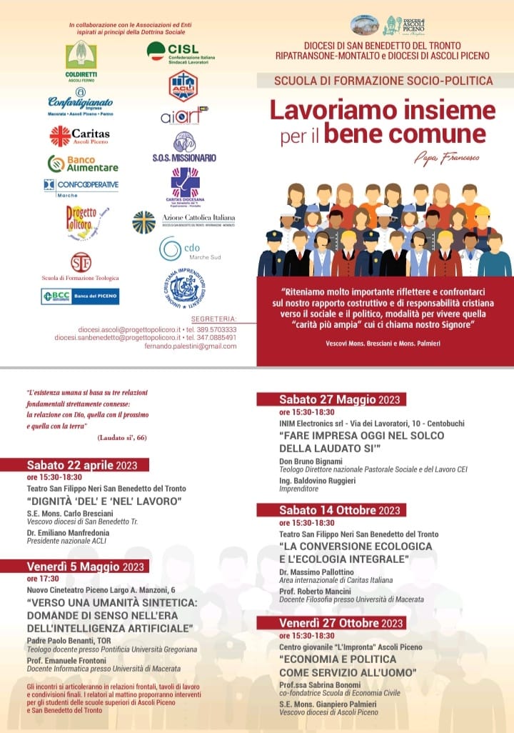 DIOCESI – Si terrà domani, 27 aprile 2023, il terzo incontro del progetto “Lavoriamo insieme per il bene comune” organizzato dalla Scuola di Formazione Socio-Politica delle Diocesi di San Benedetto del Tronto – Ripatransone – Montalto e di Ascoli Piceno, guidate rispettivamente dai vescovi Mons. Carlo Bresciani e Mons. Giampiero Palmieri.