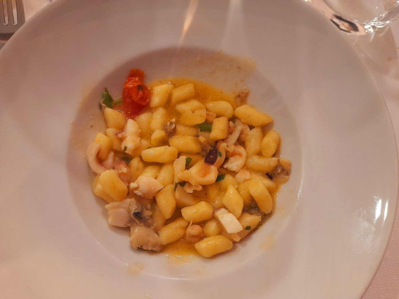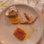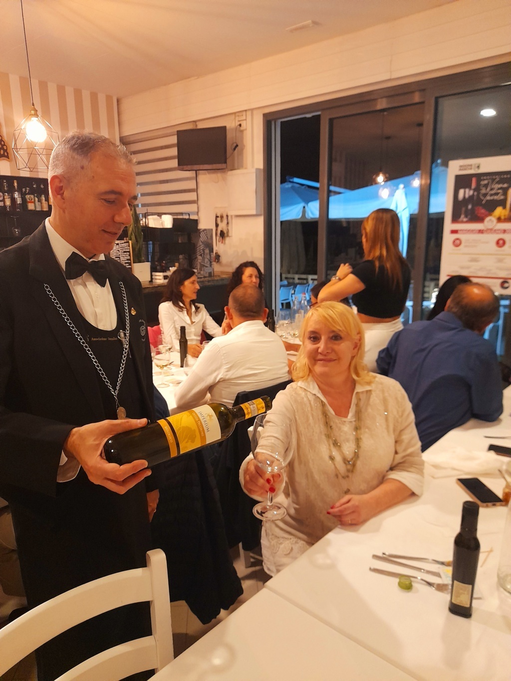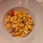 Tre sono state le aziende enologiche promosse durante la cena dal Sommelier Ivan Millanaccio, appartenente all’AIS Marche (Associazione Italiana Sommelier della nostra regione) – delegazione di Ascoli Piceno, il quale ha abbinato ad ogni piatto un vino di una cantina diversa: “Venerdì sera abbiamo davvero viaggiato per tutta la regione Marche, assaggiando vini provenienti da cantine che coprono tre province marchigiane diverse. Abbiamo iniziato dal Fermano: con il ricco antipasto, infatti, costituito da crudités di mare, alici, salmone affumicato, frittura di paranza e cozze alla marinara, ho servito una Passerina, ‘La Musa’ della Cantina Di Ruscio di Campofilone, un Marche IGT che è un classico per questo tipo di abbinamento, grazie alla sua completezza, struttura e sapidità. Siamo poi passati per il territorio Maceratese: con il primo, infatti, ovvero gnocchi di patate ai frutti di mare, ho accompagnato una Ribona della Cantina Sant’Isidoro di Corridonia, un vino che si distingue dal primo perché più fruttato e maggiormente minerale. Siamo giunti infine nel Piceno: infatti, per il secondo, un’ombrina al forno con patate arrosto, ho scelto un Pecorino della Cantina Villa Imperium di Ripatransone, un vino molto ben strutturato e completo che ha ben sostenuto il piatto. Hanno infine completato il lauto pasto alcuni dolcetti alla marmellata”.
