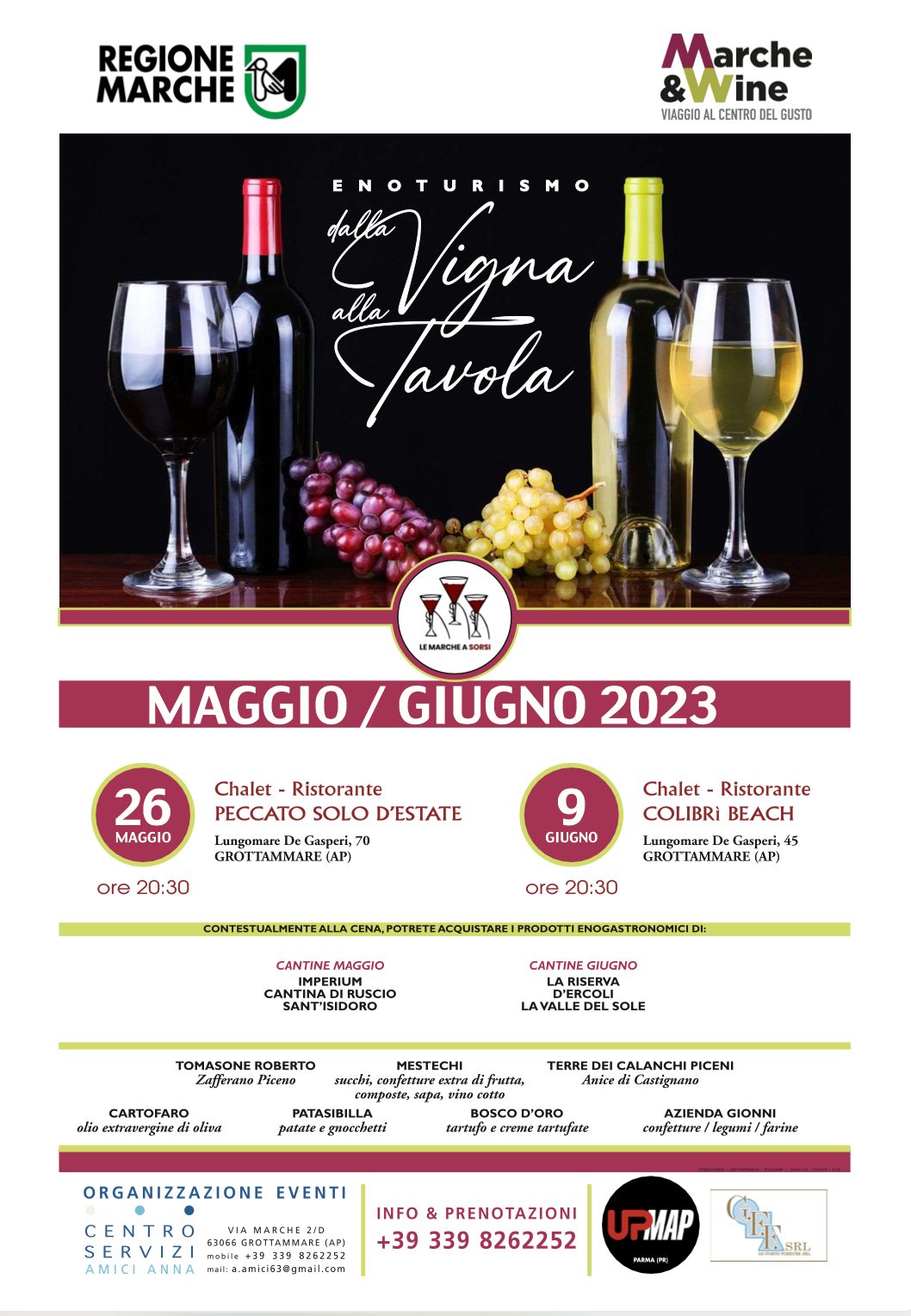 Il prossimo ed ultimo appuntamento del progetto si terrà venerdì 9 giugno, alle ore 20:30, presso lo Chalet Ristorante “Colibrì Beach” di Grottammare. Chiunque volesse ricevere informazioni o prenotare può farlo inviando un messaggio su WhatsApp oppure contattando la segreteria organizzativa al 339 8262252. Per le chiamate il numero è attivo tutti i giorni dalle 15:00 alle 18:00. È inoltre possibile seguire tutti gli aggiornamenti del progetto sulla pagina Facebook appositamente dedicata al “Marche&Wine Enoturismo Marche: dalla vigna alla tavola – Le Marche a sorsi”, collegandosi in qualsiasi momento al seguente link: https://www.facebook.com/lemarcheasorsi/.