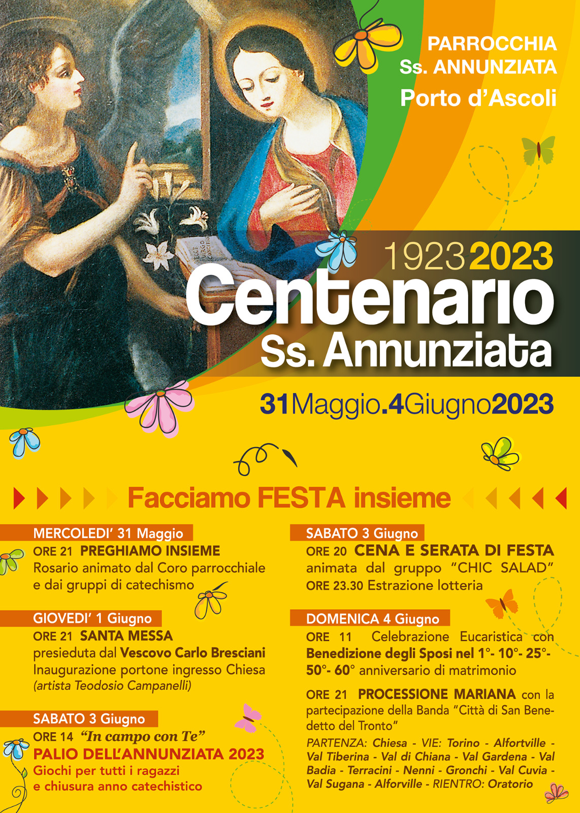 Queste le parole del parroco don Alfredo Rosati alla vigilia della festa: “Finalmente, dopo tre lunghi anni di sospensione dovuta alle norme restrittive per arginare la pandemia, la nostra Parrocchia ripropone la Festa in onore della Ss. Annunziata. La felice concomitanza della ricorrenza del I° centenario della costituzione della Parrocchia (3 maggio 1923-2023), arricchisce di gratitudine il desiderio di ritrovarci insieme per celebrare solennemente le lodi al Padre del cielo. Nella sua bontà Egli ha scelto Maria Santissima come “luogo” prediletto per la nascita del suo Unigenito Figlio e l’ha donata anche a noi come modello di accoglienza della sua Parola, di risposta al suo Amore, di collaborazione al suo progetto di salvezza. Per una Parrocchia la festa rappresenta un momento forte di vita comunitaria; condividendo ricordi, idee nuove, desideri e speranze, si realizza una tappa fondamentale del cammino di crescita dello spirito di unità, insieme al messaggio verso le nuove generazioni che, dentro i cambiamenti dei modi di vivere e di credere, resta inalterato nei cuori di ciascuno il bisogno di incontrarsi, conoscersi, volersi bene, mettersi insieme per realizzare qualcosa di bello che rimanga per sempre. Per questo la Vergine Madre ci è di esempio, spronandoci al coraggio delle scelte, per riproporre in modo nuovo l’annuncio della Buona Notizia del Vangelo e rinnovare l’esperienza della fede, che ci permette di trovare ancora una sintonia con la domanda profonda del nostro cuore: “Cosa devo fare per essere felice?” (Cf. Mt 19,16). Anche la Festa della Parrocchia può diventare un’occasione per riscoprire la Chiesa come Casa del Signore, pronto a donare gioia e pace a tutti i suoi figli. Quella gioia vera che nasce quando ci si sente accolti, stimati, amati, invitati a prendere parte al banchetto della vita. Quella pace che riempie il cuore e che permette di affrontare le sfide con la forza dello Spirito Santo, l’amore di Dio e del suo Figlio Gesù. A tutti i fedeli della nostra Parrocchia Ss. Annunziata auguro di “scendere in campo” con convinzione per partecipare da protagonisti alla Festa, preparata con cura da molti collaboratori, che ringrazio e che insieme a me attendono con gioia di salutare e abbracciare chiunque verrà. Attraverso la “Porta dell’Angelo” (il portone centrale della Chiesa), abbellito delle formelle realizzate dal Maestro Teodosio Campanelli – opera resa possibile dal contributo di un amico benefattore- siamo chiamati ad entrare nella comunione con il Dio della storia.