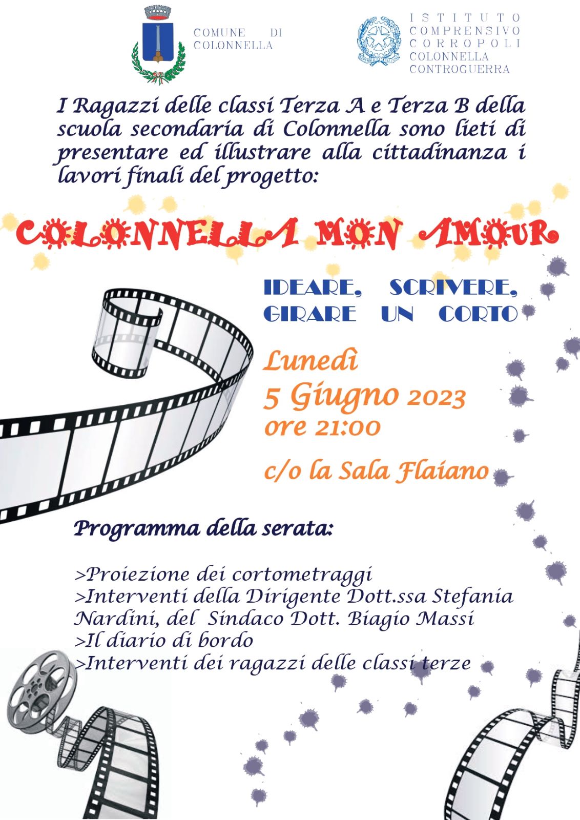 COLONNELLA – “Colonnella Mon Amour”: è questo il tema di fondo dei due cortometraggi che verranno proiettati lunedì 5 giugno, alle ore 21:00, a Colonnella, presso la Sala Flaiano, e che sono stati creati dagli studenti delle Classi 3°A e 3°B della Scuola Secondaria di Primo Grado di Colonnella, nell’ambito del Progetto “Sindaco dei Ragazzi”. L’evento rappresenterà la conclusione di un progetto, iniziato ad ottobre 2022, che utilizza il cinema come strumento per la didattica e che vede Colonnella come ente capofila nei territori limitrofi.
