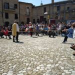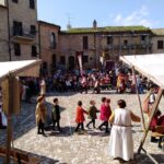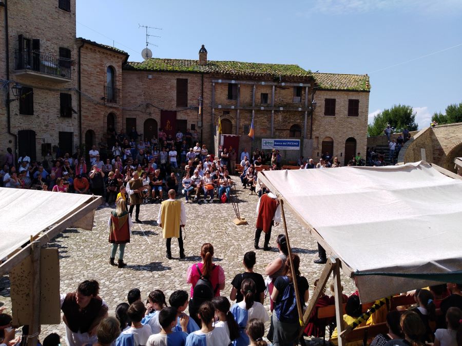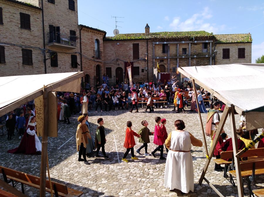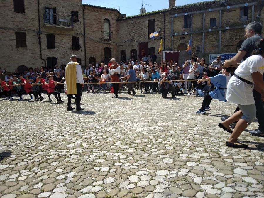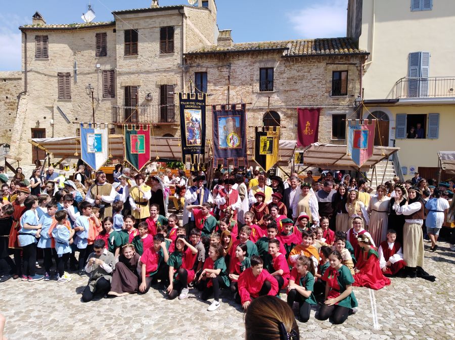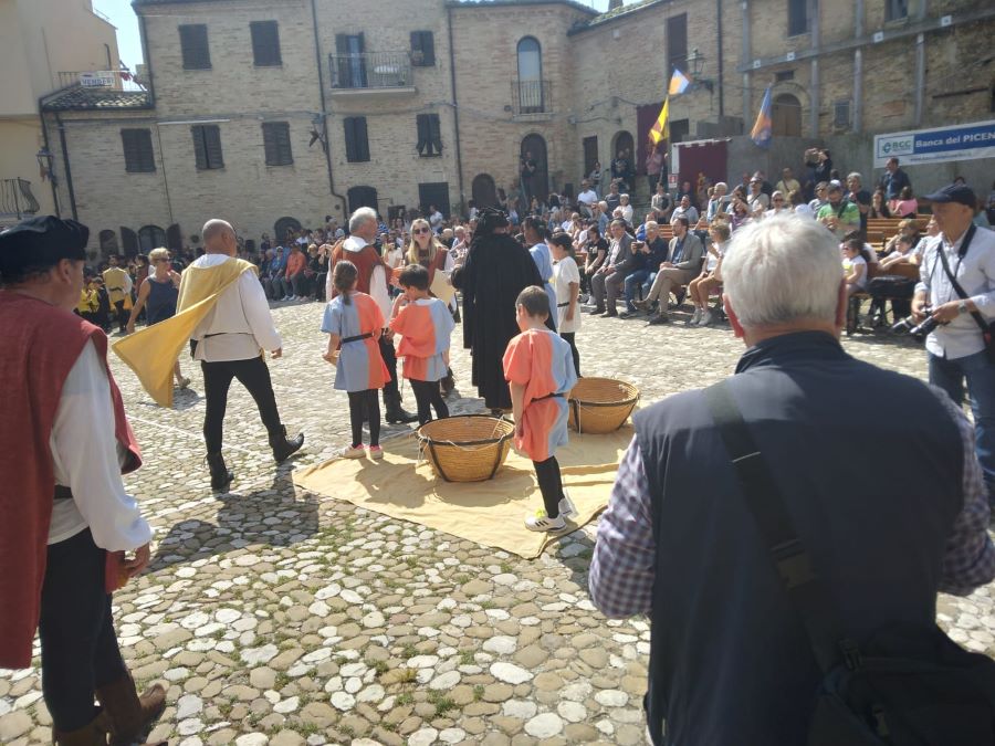 ACQUAVIVA PICENA – L’edizione XX del Palio dei bambini di Acquaviva Picena ha ottenuto un grande successo. Il Palio dei bambini è stato organizzato dall’Ente associazione Palio del Duca aps, presidente cav. Nello Gaetani, con la collaborazione dell’Istituto Scolastico Comprensivo Statale Spinetoli Monsampolo del Tronto – Acquaviva Picena. I ragazzi dell’Istituto sono stati suddivisi in quattro Rioni: i ragazzi di Acquaviva Picena hanno formato i due rioni di Aquila e Civetta, i ragazzi di Spinetoli hanno rappresentato il rione del Falco e i ragazzi di Monsampolo hanno vestito i colori del Picchio, le quattro squadre si sono contese l’ambito Drappo attraverso dei divertentissimi giochi, il Falco è stato il Rione che, vincendo, si è aggiudicato il Palio. Un ringraziamento doveroso ai Comuni di Acquaviva Picena, Spinetoli, Monsampolo del Tronto per il Patrocinio, all’istituto scolastico, agli insegnati, al dirigente scolastico, agli alunni e alle famiglie. Si ringrazia la Banca del Piceno. Si ringrazia la Provincia di Ascoli Piceno e il Consiglio Regionale delle Marche. Si ringrazia il M° Tiziana Neroni per aver preparato, in poco più di due mesi, un numeroso gruppo di tamburini, i quali saranno le nuove leve di Sponsalia “Noi siamo la storia”.