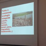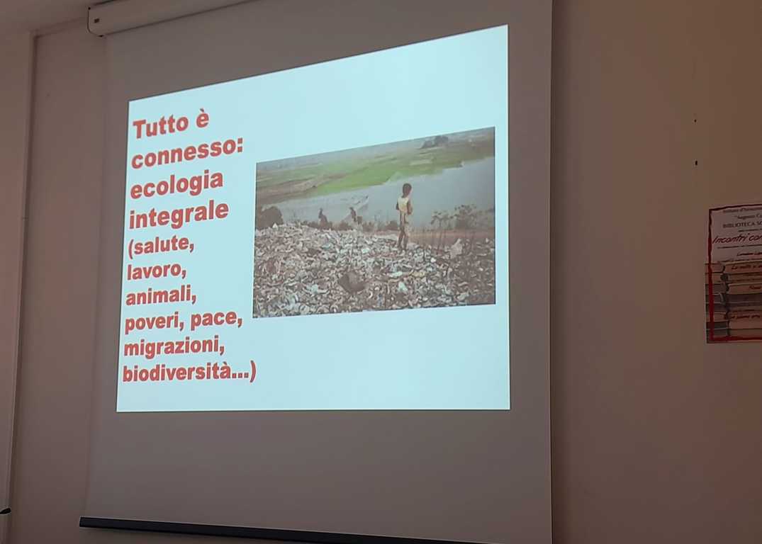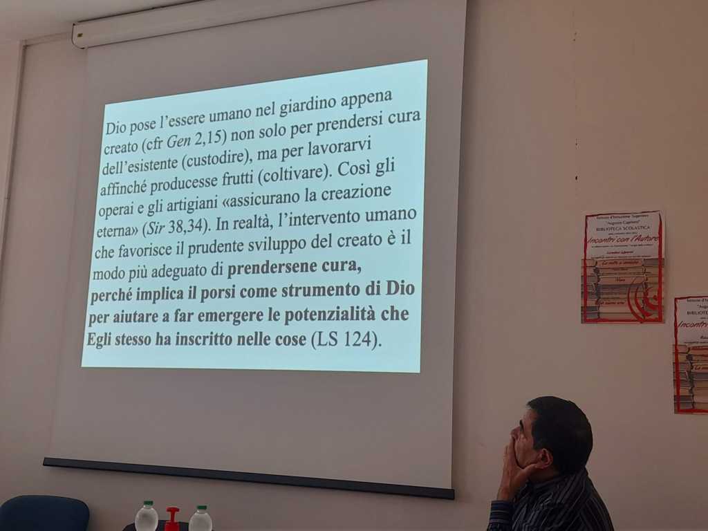 Attraverso un excursus sui temi principali trattati da papa Francesco nell’enciclica “Laudato si’, don Bignami ha affrontato molteplici argomenti che sono risultati di interesse per gli studenti: il rapporto tra lavoro e democrazia, il legame tra lavoro e comunità, le interconnessioni tra lavoro e tutto ciò che ci circonda, il significato dell’espressione ecologia integrale, l’importanza di pensare, progettare e realizzare un’economia sostenibile. Per meglio spiegare il tema trattato e anche il significato delle interconnessioni, l’illustre relatore ha raccontato agli studenti il lavoro egregio compiuto negli ultimi anni dalla Marineria Sambenedettese: “Voi sapete l’immenso lavoro che i vostri pescatori stanno facendo. Sempre più spesso, purtroppo, quando tirano su le reti, oltre al pescato, essi si ritrovano tanti rifiuti, soprattutto di plastica. In passato c’era l’abitudine di ributtare in mare tutti gli oggetti trovati, sia per risparmiare tempo, sia perché, una volta tornati a terra, i pescatori avrebbero dovuto pagare per i rifiuti da smaltire. I vostri pescatori, già da alcuni anni, hanno deciso di non ributtarli in mare, bensì di riconsegnarli a terra, così da ripulire le acque del vostro mare. È per tale ragione che papa Francesco ha più volte ringraziato i vostri pescatori che, per primi, hanno capito il significato delle interconnessioni, dell’ecologia integrale. La pesca non è qualcosa a sé rispetto ai rifiuti: gli oggetti di plastica che finiscono in mare, con il tempo, si frantumano in tante scaglie di microplastica che finiscono per divenire cibo per i pesci, quegli stessi che poi finiscono sulle nostre tavole. Dunque non è possibile prendere in considerazione solo un aspetto e lasciare tutti gli altri fuori; al contrario, se abbiamo a cuore il nostro futuro, è importate tenere insieme i temi e pensare sempre di più ad una economia sostenibile, per i singoli e per il pianeta“.