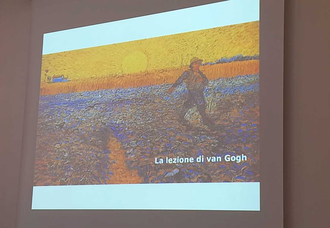 Dopo aver parlato del fenomeno delle sempre più frequenti dimissioni di massa, dei giovani che protestano durante i “Fridays for future“, dell’individualismo e dell’importanza del lavoro di squadra ed infine delle maggiori sfide che il mondo del lavoro dovrà affrontare nei prossimi anni, don Bignami ha concluso il suo intervento mostrando il celebre dipinto “Seminatore al tramonto” del pittore olandese Vincent van Gogh. Queste le sue parole: “La soluzione alle domande che ci siamo posti oggi è in questo famoso quadro: il seminatore, che è anche un’icona biblica, quindi densa di significati, si lascia alle spalle la giornata che sta per terminare, ovvero il mondo che sta tramontando, e volge lo sguardo verso l’alba del nuovo giorno. Anche noi, come il seminatore, siamo chiamati a fare così, a non rimpiangere il passato, a non volgere la nostra vita verso quello muore, bensì a seminare per andare verso un futuro nuovo e bello“.