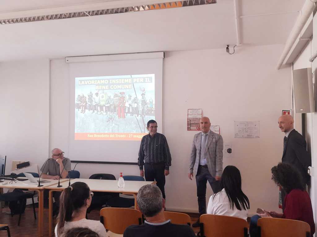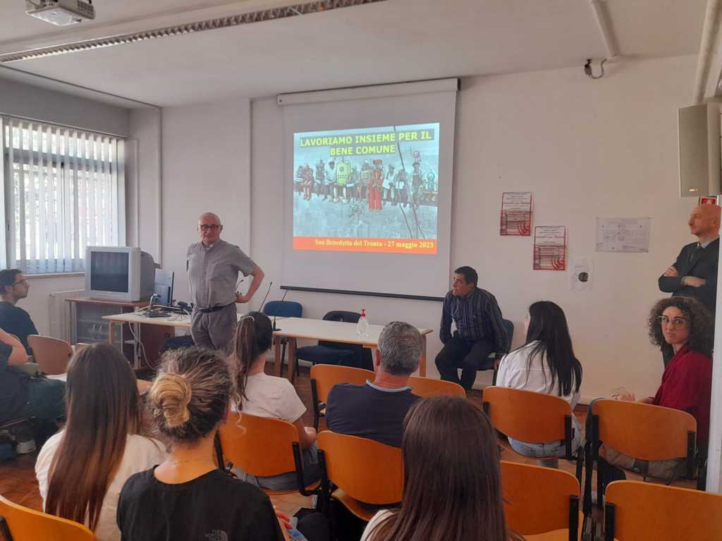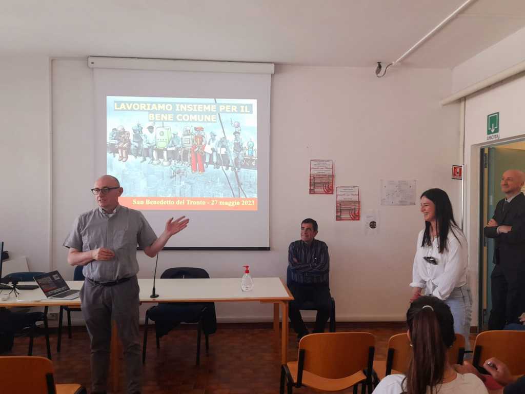 SAN BENEDETTO DEL TRONTO – “L’incontro con gli studenti è stato molto bello e fruttuoso. Il confronto con i giovani ci ha permesso di capire, ancora una volta, come ci sia bisogno di seminare modelli culturali, che talvolta noi diamo per scontati, ma che in realtà sono stati smantellati. Penso al modello della responsabilità della cura, della capacità di pensarsi dentro una società e anche della capacità di pensare insieme, di creare una cultura non dell’isolamento, bensì della relazione, di creare connessioni. Questo aspetto è molto prezioso per tutti, in particolare per gli studenti che pensano e guardano al futuro”. – È con queste parole che don Bruno Bignami, teologo, docente, scrittore, direttore dell’Ufficio Nazionale per i problemi sociali e il lavoro della CEI e dell’Ufficio Nazionale Apostolato del Mare, ha commentato l’incontro dal titolo “Fare impresa oggi nel solco della Laudato Si’“, avvenuto sabato 27 maggio, dalle ore 11:15 alle ore 13:00, presso i locali dell’Istituto di Istruzione Superiore “Augusto Capriotti”.