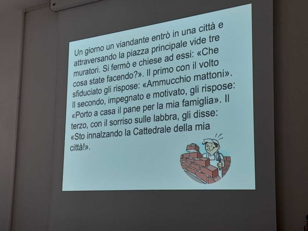 L’incontro è entrato poi nel vivo con le riflessioni di don Bignami, il quale, ha esordito dicendo: “Partiamo da una storia. Un giorno un viandante entrò in città e, attraversando la piazza principale, vide tre muratori, si fermò e chiese ad essi. ‘Che cosa state facendo?’ Il primo, con il volto sfiduciato, gli rispose: ‘Ammucchio mattoni’. Il secondo, impegnato e motivato, gli rispose: ‘Porto a casa il pane per la mia famiglia’. Il terzo, con il sorriso sulle labbra, gli disse: ‘Sto innalzando la Cattedrale della mia città’. Tutti e tre i protagonisti del racconto stanno facendo la stessa cosa, ma la loro diversa motivazione cambia la prospettiva del loro lavoro. Questa storia, dunque, ci rivela che ognuno di noi può decidere, di volta in volta, se limitarsi a fare il compitino o se eseguire con passione il proprio lavoro, dando il proprio contributo e facendo la propria parte all’interno di un progetto più ampio. Noi siamo chiamati a costruire qualcosa di nuovo e di grande attraverso il nostro lavoro, perché è proprio attraverso il lavoro, che noi ci prendiamo cura del mondo“.