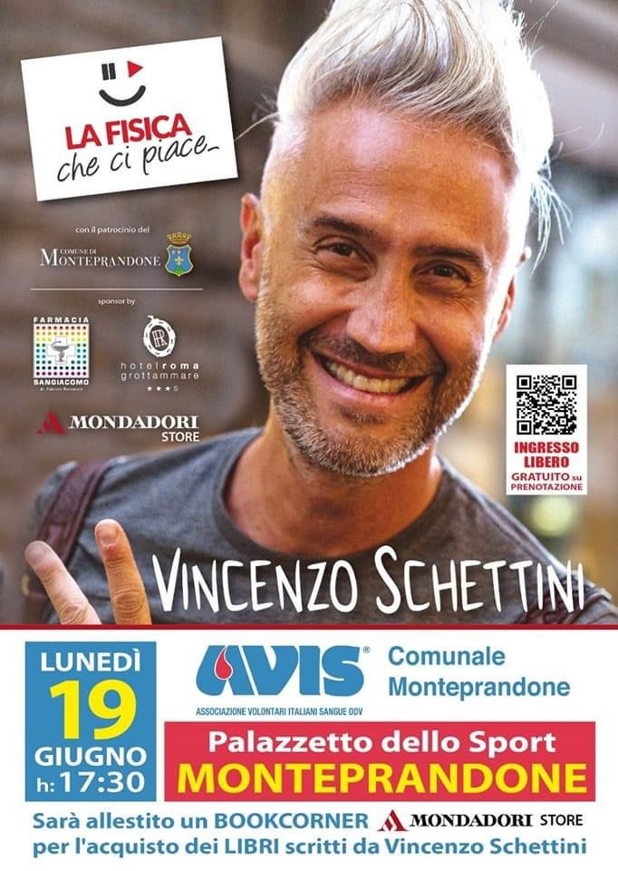 MONTEPRANDONE – Ospite d’eccezione al Palazzetto dello Sport di Monteprandone, lunedi 19 Giugno alle 17:30; il “Prof più social d’Italia”, Vincenzo Schettini, incontrerà i suoi fan a suon di lezioni di fisica e non solo.