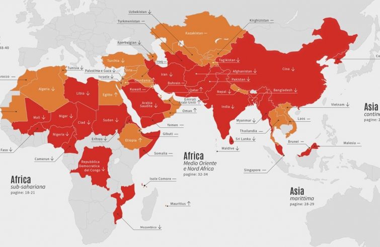 Tre categorie. Tre le categorie in cui i Paesi vengono suddivisi: Rossa, Arancione e ‘Sotto osservazione’. La categoria Rossa indica la ‘persecuzione’ e include 28 Paesi in cui vive un totale di 4,02 miliardi di persone, pari al 51,6% della popolazione mondiale. Arancione (discriminazione) sono classificati 33 Paesi nei quali si è registrato un notevole cambiamento durante il periodo di revisione. Infine i Paesi ‘Sotto osservazione’, le cui schede indicano “non solo un progressivo peggioramento delle violazioni, ma rivelano anche episodi che rientrano nelle varie classificazioni di intolleranza, discriminazione e talvolta anche persecuzione”. La categoria Rossa, che denota l’esistenza di persecuzioni, include 28 Paesi che ospitano 4,03 miliardi di persone, le quali complessivamente rappresentano più della metà (51,6 per cento) della popolazione mondiale. Di questi 28 Paesi, 13 si trovano in Africa, dove in molte regioni la situazione è drasticamente peggiorata. La categoria Arancione, che segnala l’esistenza di discriminazioni, comprende 33 Paesi, dove vivono quasi 853 milioni di persone. La categoria “Sotto osservazione” comprende Paesi in cui sono stati evidenziati fattori critici emergenti che possono potenzialmente causare un deterioramento significativo della libertà religiosa.