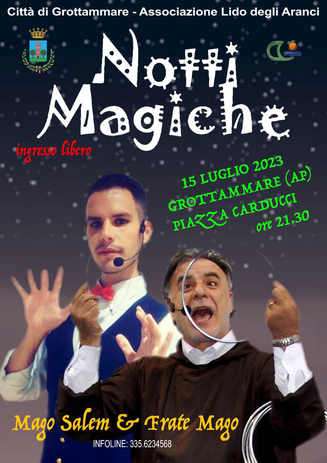 GROTTAMMARE – Sabato 15 luglio alle ore 21.15 in Piazza Carducci a Grottammare si alzerà il sipario sulla rassegna di Magia “Notti Magiche”. L’evento organizzato dall’Associazione Lido degli Aranci con il patrocinio del Comune di Grottammare, vedrà le meravigliose esibizioni di Frate Mago e di Mago Salem, legati tra loro da 2 grandi passioni: la magia e l’amore francescano per il prossimo.
