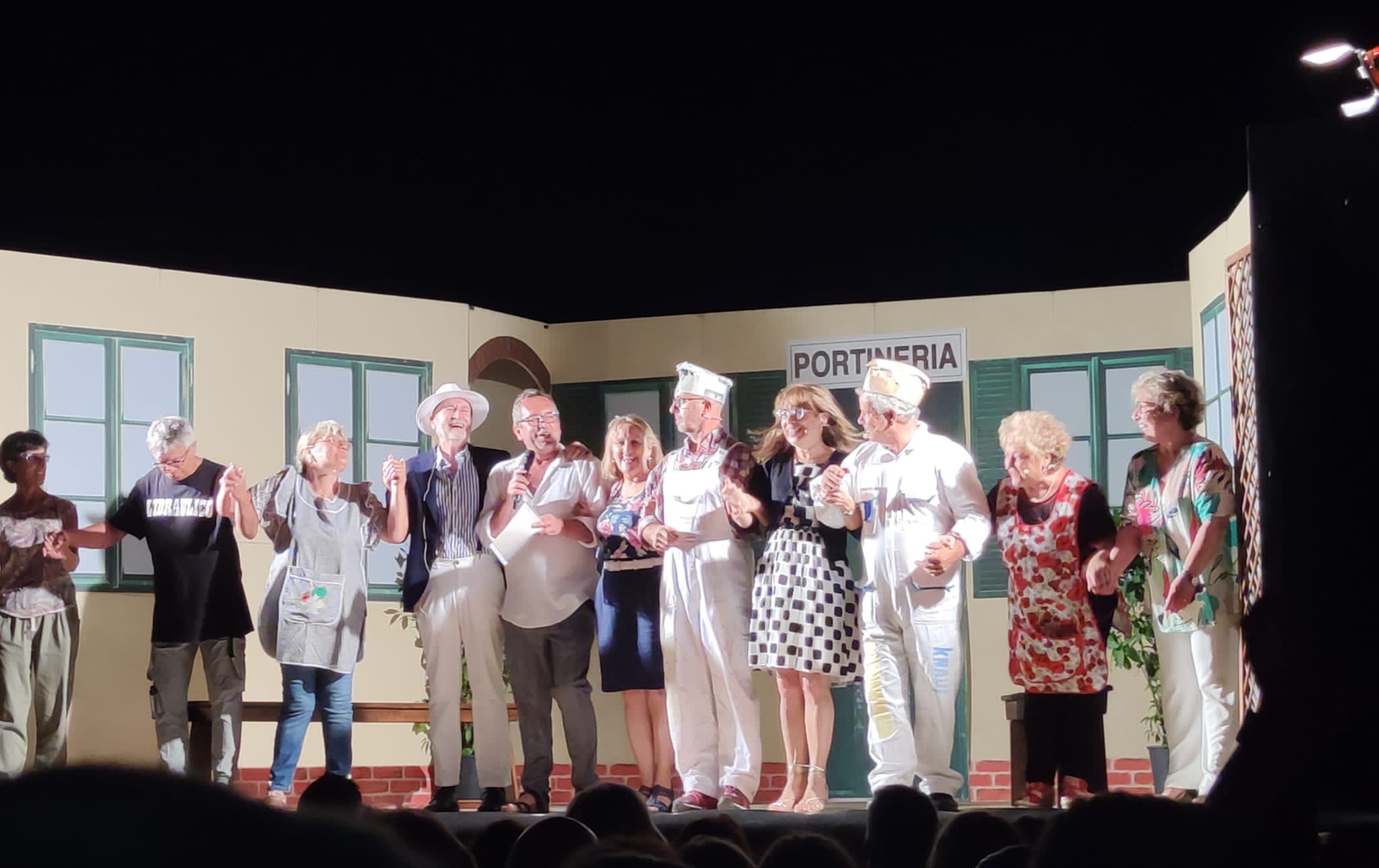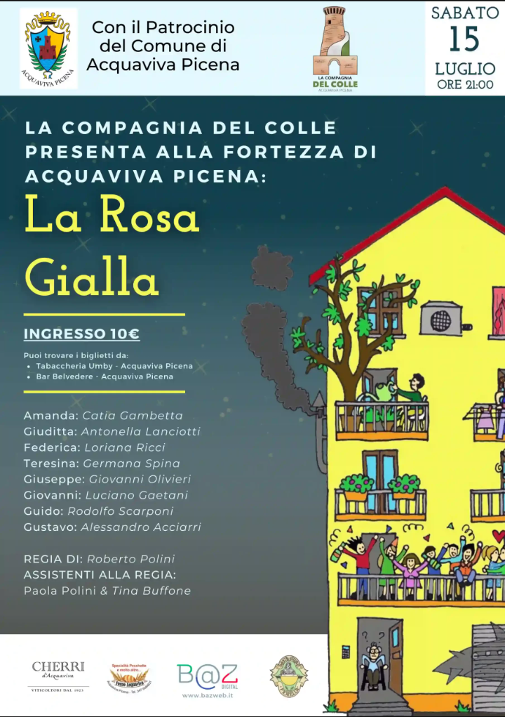 ACQUAVIVA PICENA – Sabato 15 luglio all’interno della Fortezza medievale di Acquaviva Picena, la “Compagnia del colle” ha messo in scena “La rosa gialla”, commedia di equivoci, umorismo, doppi sensi, sorprese, tutto condito con la bravura degli attori. La “Compagnia del colle”, reduce di tanti successi e detentrice di premi, ha ottenuto anche questa volta un grande successo e i complimenti dei presenti. La storia narra di una signora, Amanda, la quale ha avuto un bambino “clandestinamente” senza mai rivelare chi fosse il padre; estenuata dai continui pettegolezzi e mormorazioni delle colleghe, Amanda decide di vendicarsi e racconta che il padre di suo figlio è uno dei mariti delle sue colleghe. Inizia così una tensione comica, un simpatico thriller dove a suon colpi di scena e battute ironiche si da il via alla “caccia al traditore”. Vengono fuori le eccentricità dei protagonisti. Si ringrazia il Comune di Acquaviva Picena per il Patrocinio e gli sponsor. Regista della rappresentazione: Roberto Polini, assistenti alla regia: Paola Polini e Tina Buffone. Interpreti: Catia Gambetta, Antonella Lanciotti, Loriana Ricci, Germana Spina, Giovanni Olivieri, Luciano Gaetani, Rodolfo Scarponi, Alessandro Acciarri.