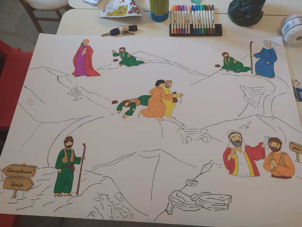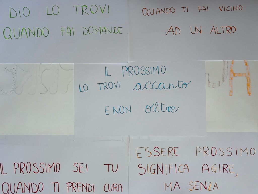 “Abbiamo lavorato seguendo le indicazioni di due sussidi – spiega Rosalinda –, quello diocesano ‘Cuori Aperti’ e quello della F.O.M. (Fondazione Oratori Milanesi) ‘TuXTutti’, entrambi incentrati sul tema dell’aver cura degli altri. La domanda cardine che ci ha guidati in questo cammino quindicinale è stata: Chi è il mio prossimo? Attraverso alcune parabole del Vangelo, come quella del Buon Samaritano e le tre della Misericordia, insieme abbiamo scoperto che il nostro prossimo è chiunque incontriamo sul nostro cammino, perché siamo tutti figli di Dio e fratelli tra noi“.