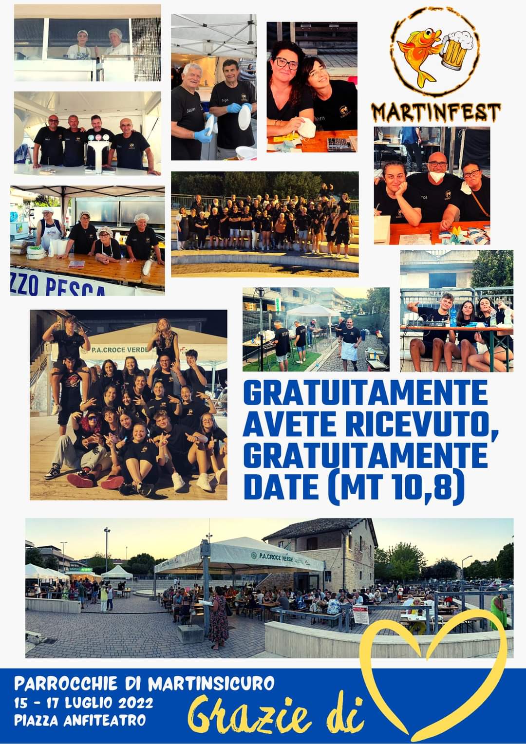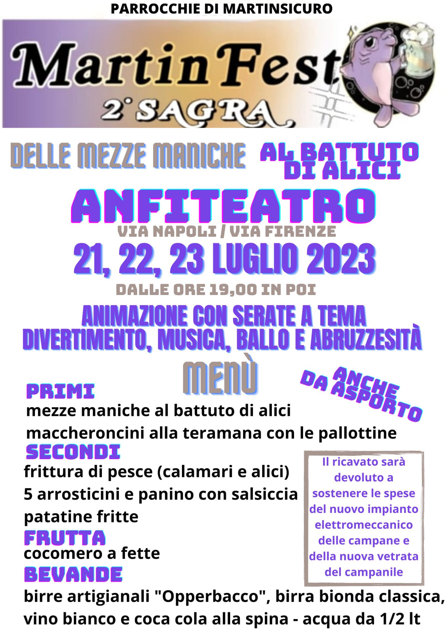 MARTINSICURO – Sta per partire la seconda edizione di Martin Fest, sagra delle mezze maniche al battuto di alici organizzata dalle Parrocchie Sacro Cuore e Madre Teresa di Martinsicuro. L’evento, che si terrà nei giorni venerdì 21, sabato 22 e domenica 23 luglio, presso l’anfiteatro di via Napoli – angolo via Firenze, avrà una finalità benefica: il ricavato, infatti, sarà devoluto alle Parrocchie per la copertura del nuovo impianto elettromeccanico delle campane e della nuova vetrata della chiesa.