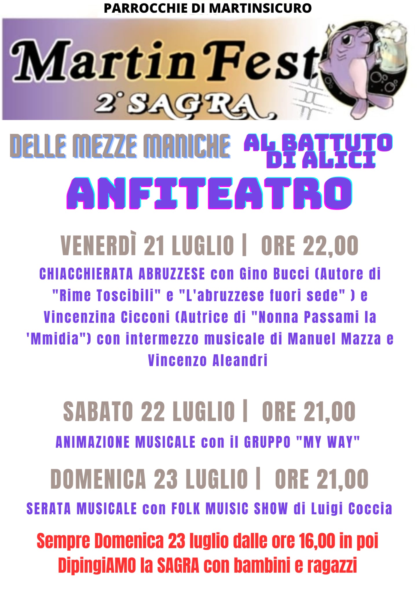 “Invito tutta la cittadinanza – conclude Concetto Di Francesco – e anche i cittadini delle località limitrofe a Martinsicuro, a partecipare a questi tre giorni del Martin Fest. Prima di tutto per godere di buon cibo e buona compagnia. Poi per vivere insieme anche momenti di festa, di musica e di cultura. In tal senso un contributo importante sarà dato dalla “chiacchierata abruzzese” tra Vincenzina Cicconi e Gino Bucci, i quali, ciascuno a suo modo, hanno celebrato il nostro territorio attraverso la rievocazione di antiche usanze, tradizioni, dialetto e storie locali. C’è poi anche una finalità benefica per la quale vale la pena partecipare alla nostra sagra e questa probabilmente è la motivazione maggiore che dovrebbe spingere tutti i fedeli a prendere parte alla nostra festa”.