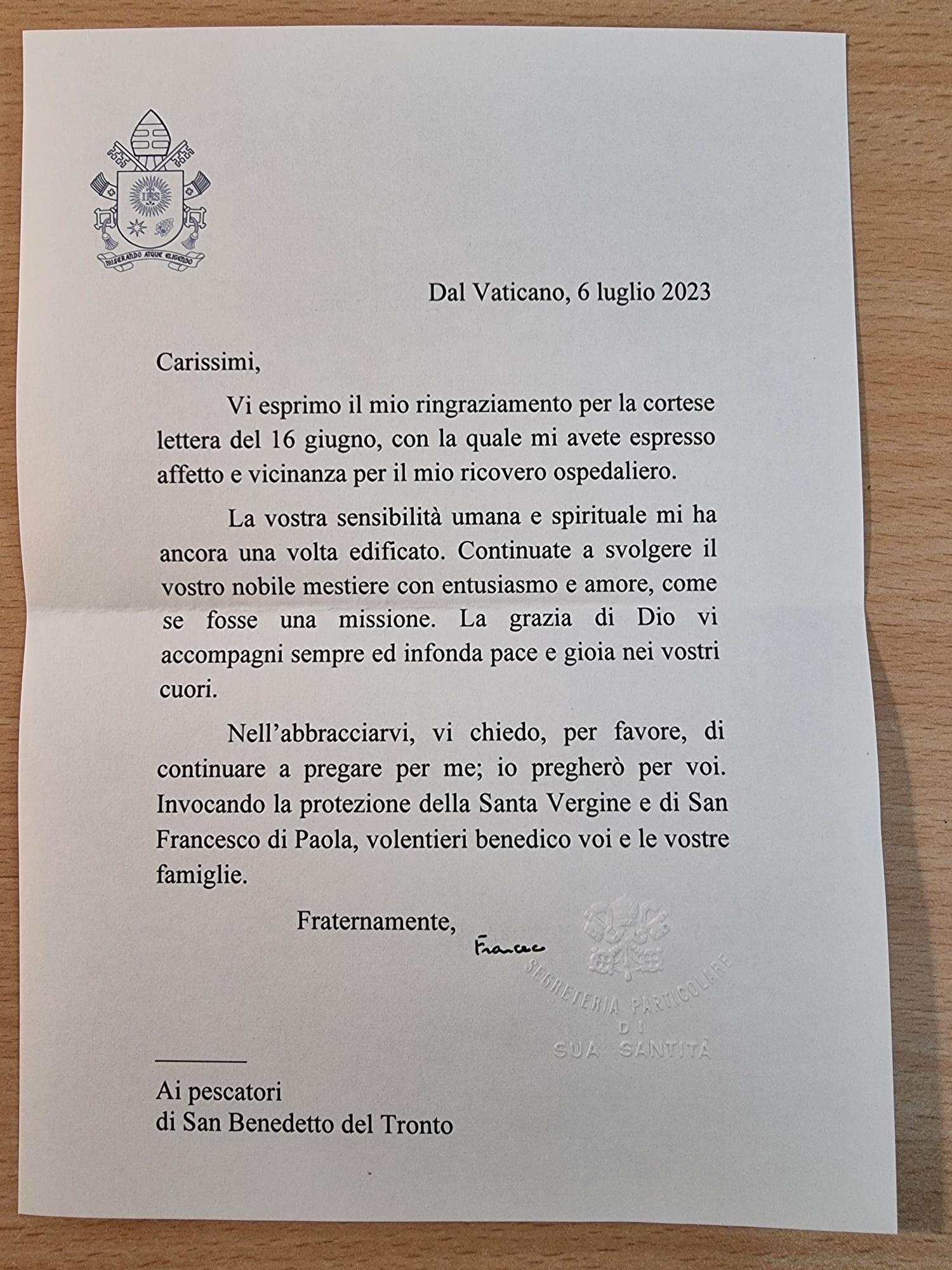 La lettera del Papa ha suscitato commozione tra i pescatori di San Benedetto e Don Peppe Giudici ha così commentato: “Con gratitudine e gioia accogliamo questa espressione di vicinanza di Papa Francesco che ha risposto con una lettera autografa ad una lettera dei nostri pescatori di San Benedetto. Ancora una volta il Santo Padre esprime vicinanza, solidarietà e apprezzamento per l’opera dei nostri pescatori riguardo anche alla raccolta della plastica e alla pulizia dei fondali marini. Non è cosa di tutti i giorni e questo ci rallegra molto e ancora una volta non smettiamo di meravigliarci della vicinanza del Santo Padre che non si stanca mai di portare i pescatori sambenedettesi come esempio di coloro che mettono in pratica l’Enciclica “Laudato Si’”.