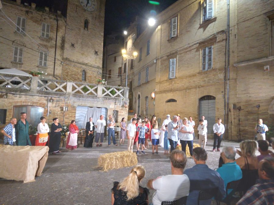 A tutti questi aggiungiamo un nutrito gruppo di “bambini del Colle”(Luigi Amabili, Rosa Amabili, Matteo Amabili, Maria Giulia Parente, Brando Narcisi, Daniele Marcozzi, Matteo Schiavoni e Samuele Santarelli) e l’eleganza delle danzatrici (Ludovica Vagni, Ovelia Ibraimi, Ludovica Stipa) della scuola “Musa.Ti” di Anita Musati sulle coreografie di Barbara Burattini. Abbiamo volutamente citato tutti i bravissimi protagonisti perché questa rappresentazione è stata davvero corale nel senso letterale del termine infatti il pubblico è stato sollecitato più volte a partecipare attivamente a momenti dello spettacolo cantando e accompagnando il tempo con le mani: il fatto che non vi fosse il palco, ma che tutto si svolgesse “tra e con il pubblico” ha rappresentato un’ulteriore novità, davvero molto gradita. Risultato? Applausi scroscianti a non finire, tanta serenità e feeling tra gli artisti e il numeroso pubblico, soddisfazione e complimenti sinceri dal sindaco e dall’amministrazione comunale e tanta tanta soddisfazione tra i soci dell’Associazione “Terraviva”, tutt’altro che fantasmi, che hanno davvero profuso impegno e generosità dimostrando, ancora una volta, l’amore per Acquaviva, per gli acquavivani e per quanti si sentono acquavivani nel cuore! Ma non finisce qui! Per quanti erano in piazza e per quanti vogliono godere ancora di una manifestazione di altissimo livello, i soci dell’Associazione “Terraviva” danno appuntamento per martedì 8 agosto, alle ore 21:00, presso la Fortezza di Acquaviva Picena per la cerimonia di conferimento della “Crolla d’Oro 2023”, prestigioso riconoscimento ad un marchigiano DOC: quest’anno, come ha svelato il presidente di “Terraviva” cav. Filippo , è stato insignito il grandissimo attore Neri Marcorè, che sarà personalmente ad Acquaviva Picena per ritirare il premio e per un momento d’incontro e amicizia con tutto il pubblico. Insieme a Marcorè ci saranno il cabarettista marchigiano Piero Stefano Macchini e il presentatore Sandro Avigliano. Insomma, si prospetta un’altra serata all’insegna del divertimento, della riflessione, della marchigianità e della solidarietà, in quanto l’incasso della serata (costo biglietto dieci euro cadauno)sarà devoluto alla Lega del Filo d’Oro, già insignita della Crolla d’Oro, due anni fa. Ma intanto, aspettando al serata di martedì 8 agosto, rinnoviamo agli attori, ai registi, agli attrezzisti, e a tutto lo staff de La Zicagna i nostri complimenti più sinceri per uno spettacolo e una serata che tanti, ma tanti, ricorderanno con piacere e a lungo!
