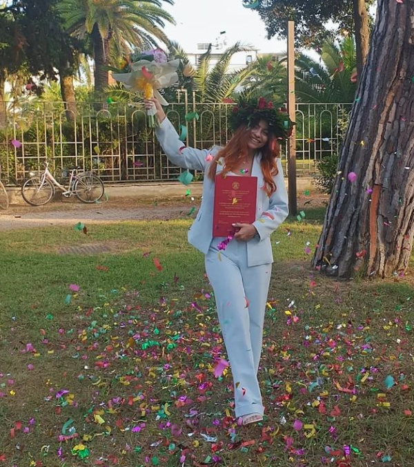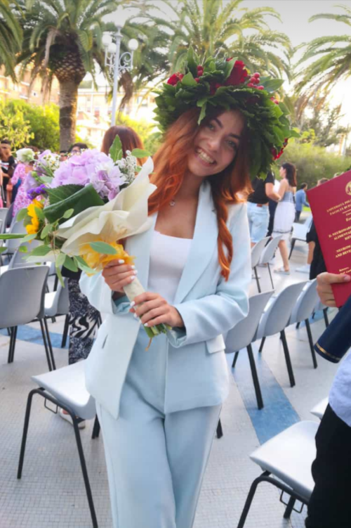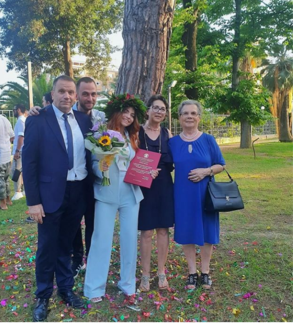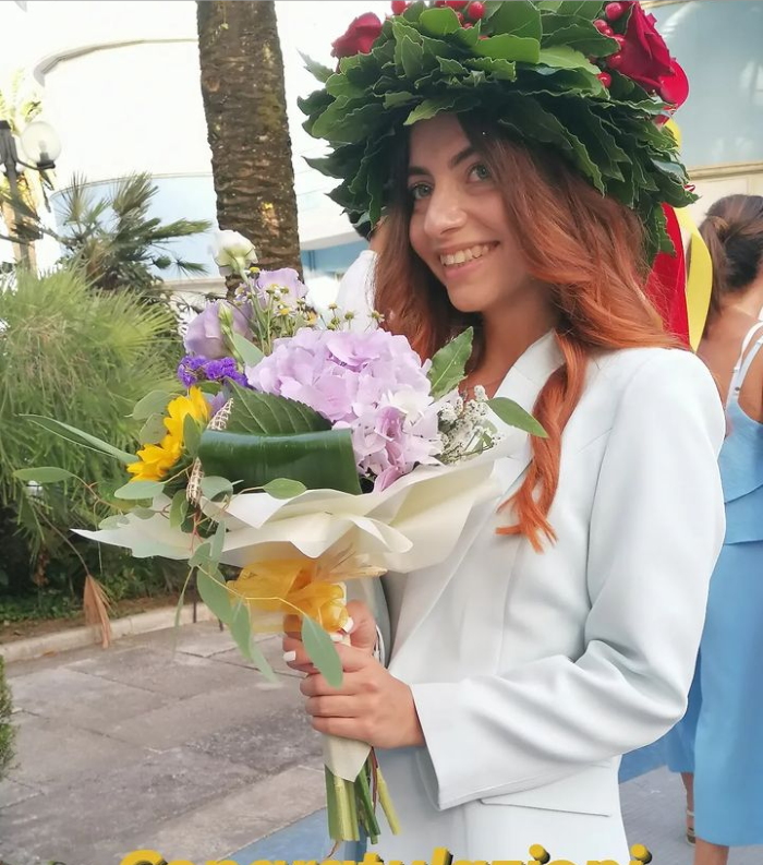 È difficile raccontare di Sara…una bellissima ragazza responsabile, intelligente, divertente, educata…una ragazza per la quale la vita non è stata sempre facile, ma che comunque non l’ha resa meno gioiosa, tenace e combattiva. Sara che insieme alla bellezza estetica unisce un buon cuore e una solida fede in Dio, è sempre vicino alla sua famiglia e ai suoi amici e tutte le volte che gli impegni glielo permettono, è sempre disposta ad aiutare senza riserve e con il suo magnifico sorriso. Mamma Clelia, il fratello Simone, nonna Ida, tutti i parenti e gli amici sono consapevoli che ora per Sara, dopo questa Laurea, si apriranno nuove prospettive e per questo pregano il Signore affinché non l’abbandoni mai e con il suo amore le dia coraggio e speranza per affrontare le sfide della vita. Sara ha espresso un suo personale pensiero in questa lieta occasione: “Alla mia famiglia, che non ha mai permesso che io mi arrendessi. Alla parte di me che non pensava sarei mai arrivata fino a qui. A tutti quelli che mi hanno sostenuto. A chi non c’è più, ma sarebbe stato molto fiero di me”.