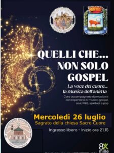 La festa poi si farà spettacolo coinvolgente sul sagrato della Chiesa del Sacro Cuore, dove alle ore 21:15 si terrà l’evento “Quelli che … non solo Gospel – La voce del cuore … la musica dell’anima“, durante il quale una corale di 25 elementi con musici di Montegranaro si esibirà in un concerto, rigorosamente dal vivo, di canto e musica non solo Gospel: i cantori, infatti, si cimenteranno in un vasto repertorio anche di musica Soul, Rhythm and Blues, Spiritual e Pop.