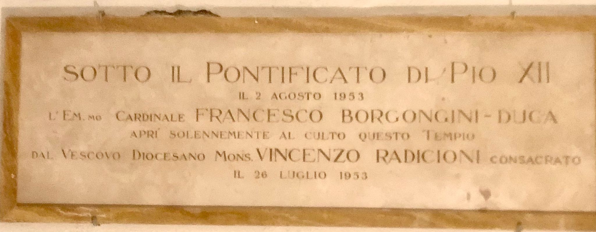 La Chiesa, progettata dall’architetto Tassotti e realizzata in cemento armato – opera avveniristica per gli anni 50 –  fu fortemente voluta da don Giuseppe De Semplicis, parroco zelante tra gli emigrati a New York. Caldeggiata da don Filippo Giovannozzi, che purtroppo non ne godé il compimento, fu portata a termine dal suo successore don Ruggero Micioni e dal loro vice don Pacifico Forlini. Il 26 luglio 1953 la Chiesa fu consacrata ad opera di S.E.R. Mons. Vincenzo Radicioni.