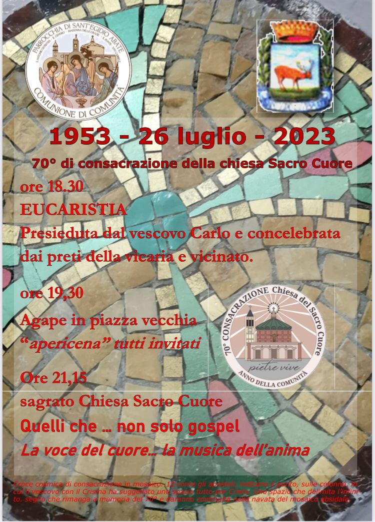 SANT’EGIDIO ALLA VIBRATA – C’è grande attesa per la festa di questa sera, 26 luglio 2023, tra i fedeli della Parrocchia Sant’Egidio Abate di Sant’Egidio alla Vibrata per il 70° anniversario di consacrazione della Chiesa Sacro Cuore.