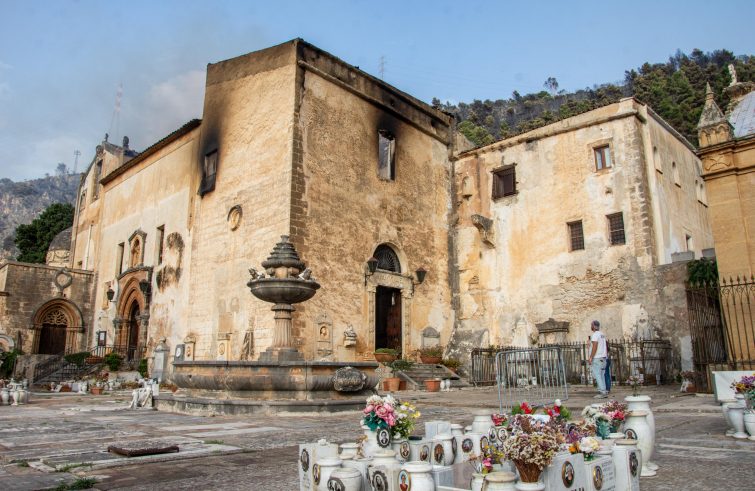 Gli incendi sono arrivati anche lì: all’ombra di Monte Grifone, sul quale sorge il complesso monumentale di Santa Maria di Gesù. Monte che ospita il convento e la chiesa, in cui fino a ieri hanno riposato le spoglie di san Benedetto il Moro, co-patrono di Palermo. Da un rogo – sembra di origine dolosa – all’interno del coro dell’edificio di culto, le fiamme hanno raggiunto le parti in legno, dal tetto ai simulacri, che sono state subito bruciate e hanno alimentato l’incendio, che in poche ore ha distrutto la chiesa.