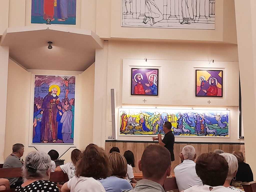 Nel corso della serata il teologo, nonché docente di Religione Cattolica e già redattore presso il nostro giornale, ha condotto i fedeli in un viaggio alla scoperta di molte delle opere di Josip Botteri Dini presenti nell’edificio sacro: dai due pannelli dell’Annunciazione, che rappresentano l’Arcangelo Gabriele e la Vergine Maria, alle due opere riguardanti la Natività, che rappresentano la scena della mangiatoia e l’arrivo dei Re Magi; dalla Quadrilogia dell’ Infanzia a quella delle Parabole della Misericordia; dall’Ultima Cena, che campeggia sull’altare, alla Passione e morte di Gesù, rappresentata nelle opere della Via Crucis, fino a giungere alle opere che ritraggono la Resurrezione.
