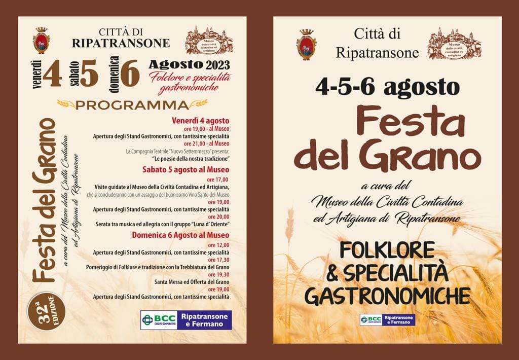 RIPATRANSONE – La Presidente e tutti i Soci del Museo della Civiltà Contadina ed Artigiana di Ripatransone, sono lieti di comunicare che Venerdì 4, Sabato 5 e Domenica 6 Agosto, ritornerà la tradizionale Festa del Grano, giunta alla sua 32a edizione.