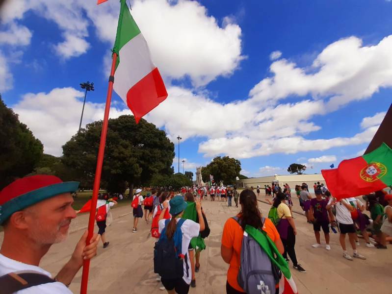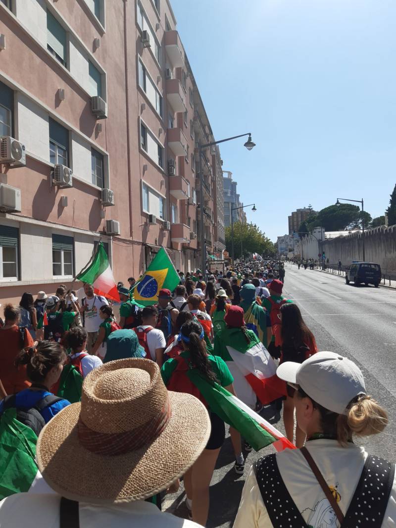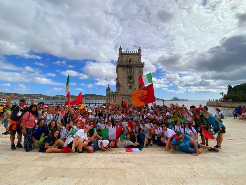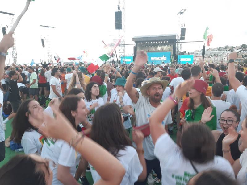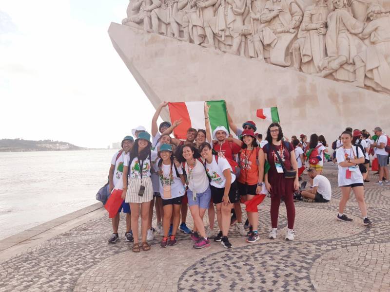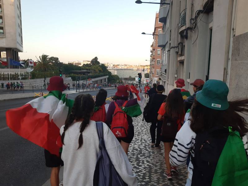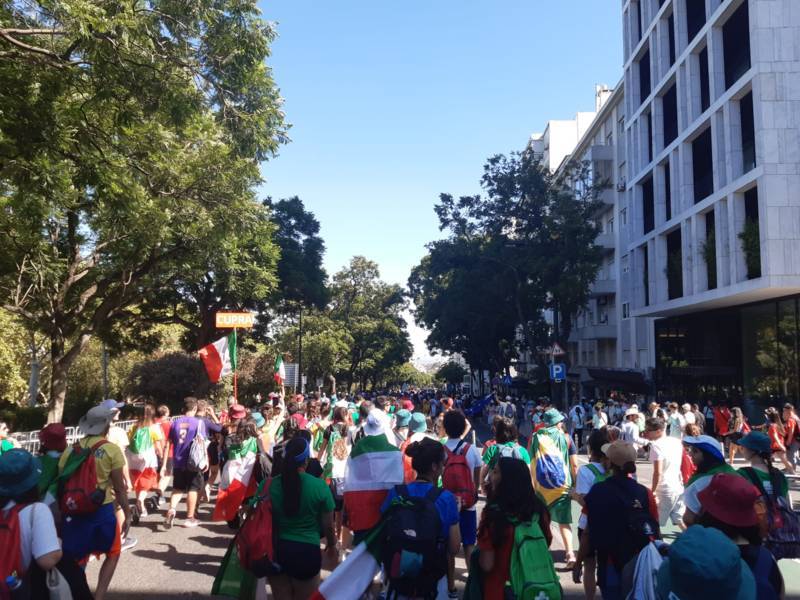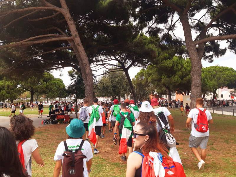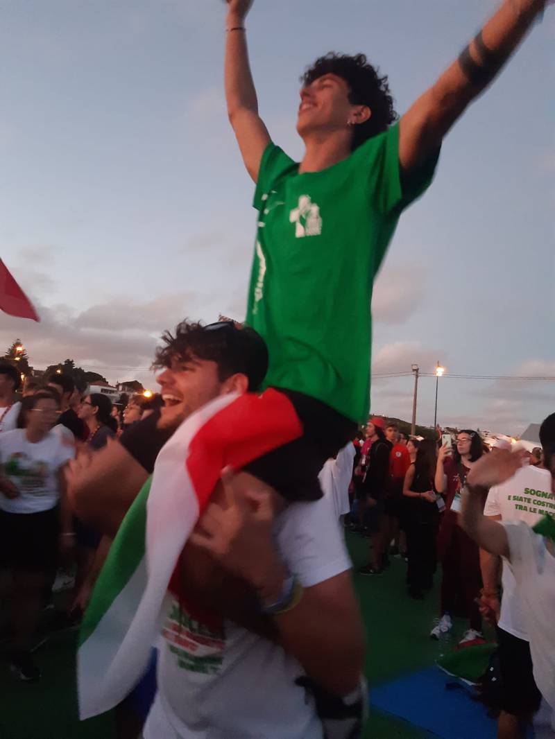 “Due sono i momenti che più ci hanno segnato – proseguono i ragazzi -. La sera di mercoledì 2 agosto abbiamo partecipato alla Festa degli Italiani, organizzata dalla Pastorale Giovanile della CEI insieme a TV2000. Presso il Passeio Marítimo di Algés, ci siamo ritrovati insieme a circa cinquantamila nostri coetanei italiani. È stata una festa/concerto molto bella! Prima abbiamo ricevuto il messaggio di saluto del presidente Mattarella e cantato l’inno di Mameli. Poi abbiamo ascoltato le testimonianze significative di alcuni personaggi celebri, come l’attrice Giusy Buscemi, la pallavolista Cristina Chirichella, lo scrittore ed insegnante Enrico Galiano, il fondatore di Libera don Luigi Ciotti e l’operatore umanitario Gennaro Giudetti, impegnato nella difesa dei diritti umani nelle zone di conflitto. Dopo questi momenti di riflessione, ci siamo scatenati ascoltando anche musica dal vivo, grazie a Fiat 131 e LDA, venuti appositamente per noi in Portogallo. Al termine del concerto, abbiamo ascoltato una riflessione del Card. Matteo Maria Zuppi, presidente della Conferenza Episcopale Italiana, il quale ci ha esortato ad allenarci ad amare Gesù, perché, amando Lui, ameremo anche noi stessi, le nostre fragilità, e anche gli altri. Abbiamo infine concluso la serata con un momento di preghiera, portando sul palco le due effigi sacre che noi ragazzi italiani abbiamo dato in dono alla Chiesa portoghese, ovvero il Crocifisso di San Damiano e l’Icona della Madonna di Loreto. Siamo andati a letto all’una, ma, nonostante la stanchezza, siamo stati veramente felici”.