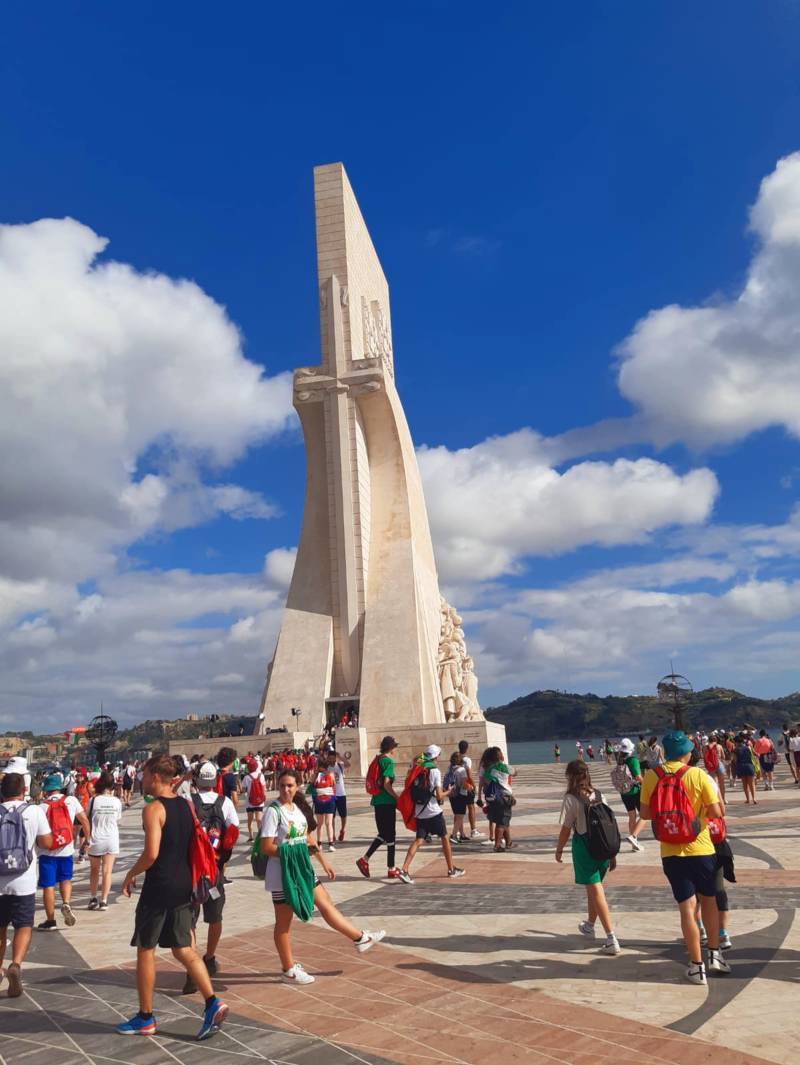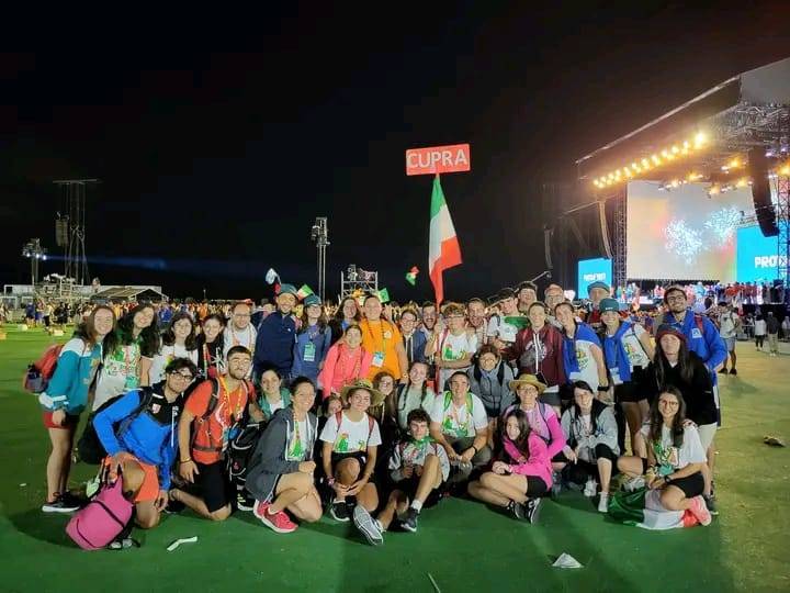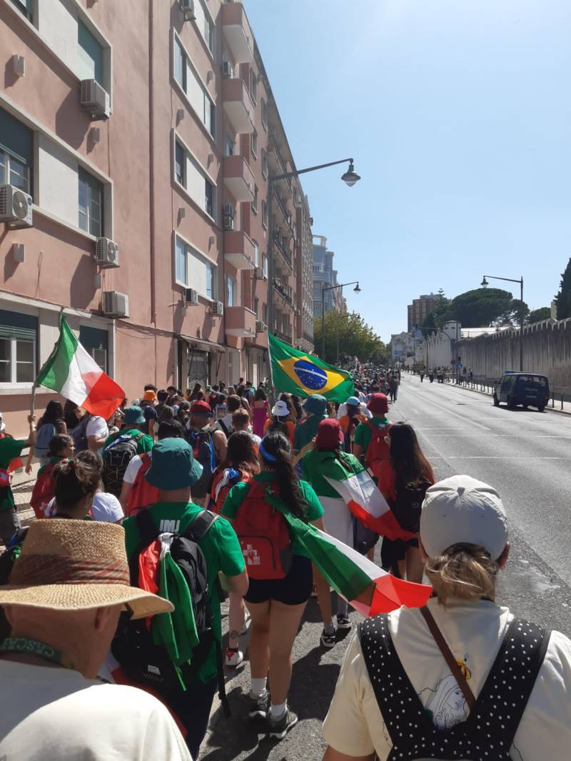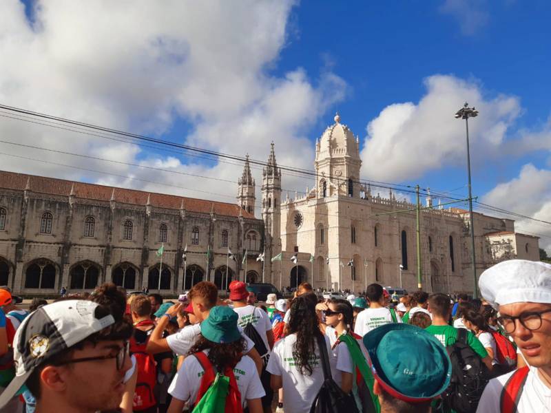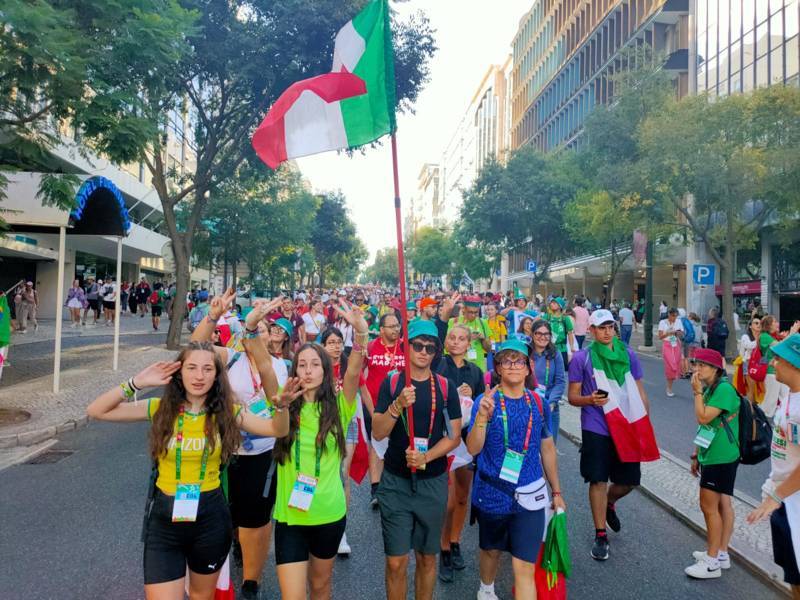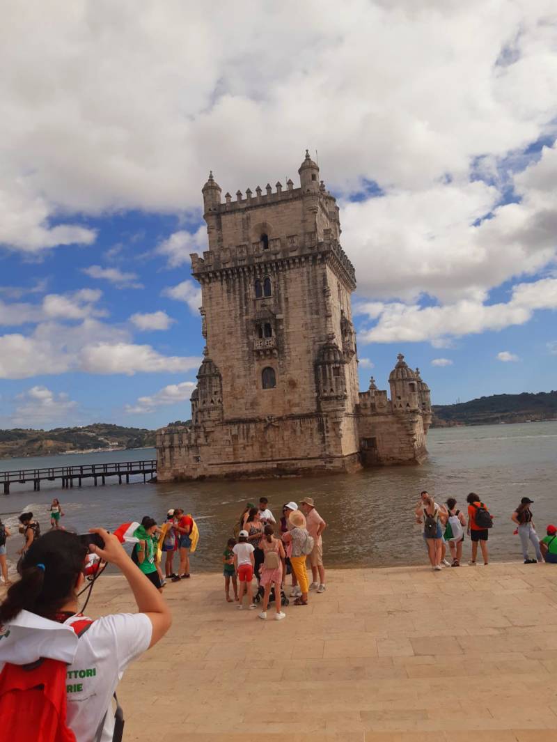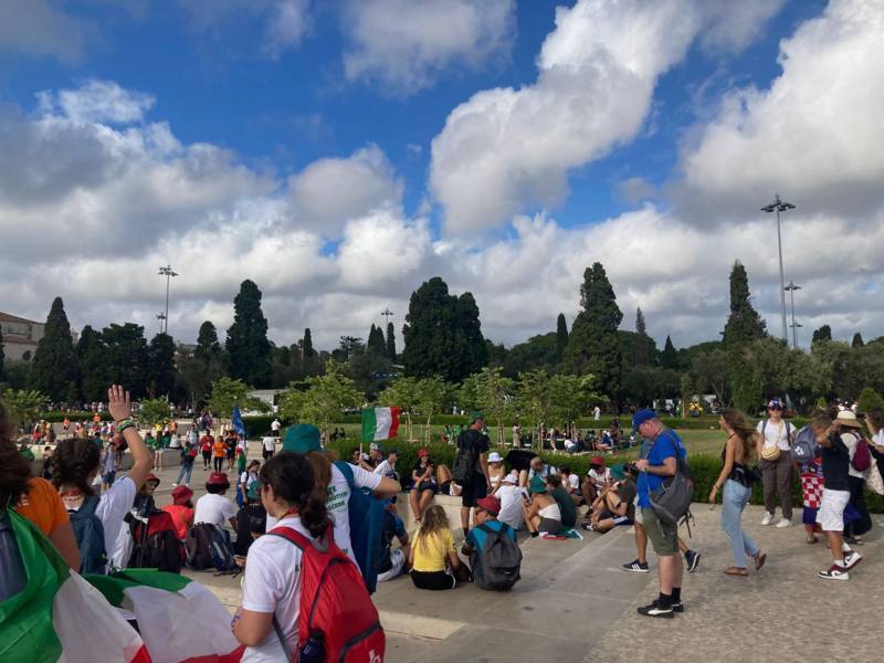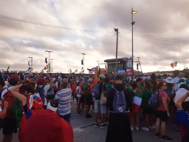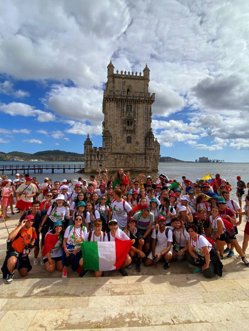 “Due sono i momenti che più ci hanno segnato – proseguono i ragazzi -. La sera di mercoledì 2 agosto abbiamo partecipato alla Festa degli Italiani, organizzata dalla Pastorale Giovanile della CEI insieme a TV2000. Presso il Passeio Marítimo di Algés, ci siamo ritrovati insieme a circa cinquantamila nostri coetanei italiani. È stata una festa/concerto molto bella! Prima abbiamo ricevuto il messaggio di saluto del presidente Mattarella e cantato l’inno di Mameli. Poi abbiamo ascoltato le testimonianze significative di alcuni personaggi celebri, come l’attrice Giusy Buscemi, la pallavolista Cristina Chirichella, lo scrittore ed insegnante Enrico Galiano, il fondatore di Libera don Luigi Ciotti e l’operatore umanitario Gennaro Giudetti, impegnato nella difesa dei diritti umani nelle zone di conflitto. Dopo questi momenti di riflessione, ci siamo scatenati ascoltando anche musica dal vivo, grazie a Fiat 131 e LDA, venuti appositamente per noi in Portogallo. Al termine del concerto, abbiamo ascoltato una riflessione del Card. Matteo Maria Zuppi, presidente della Conferenza Episcopale Italiana, il quale ci ha esortato ad allenarci ad amare Gesù, perché, amando Lui, ameremo anche noi stessi, le nostre fragilità, e anche gli altri. Abbiamo infine concluso la serata con un momento di preghiera, portando sul palco le due effigi sacre che noi ragazzi italiani abbiamo dato in dono alla Chiesa portoghese, ovvero il Crocifisso di San Damiano e l’Icona della Madonna di Loreto. Siamo andati a letto all’una, ma, nonostante la stanchezza, siamo stati veramente felici”.
