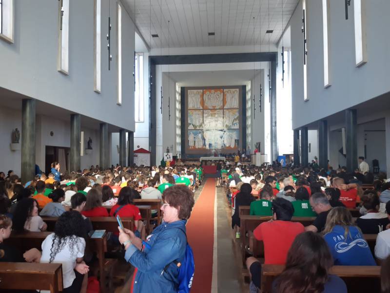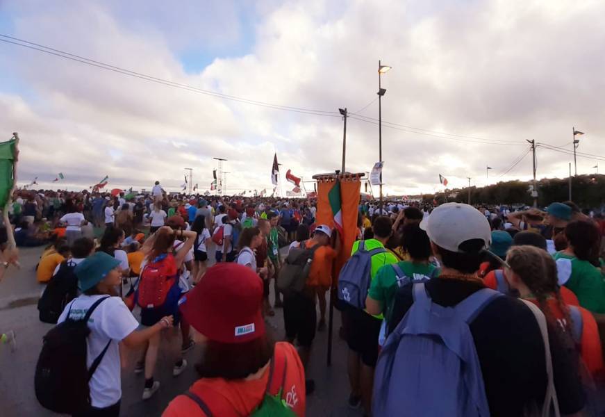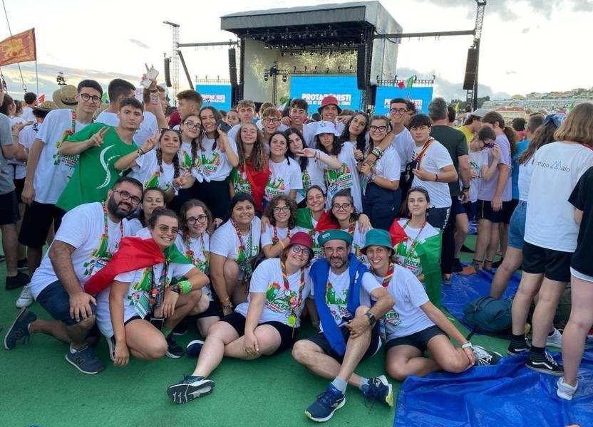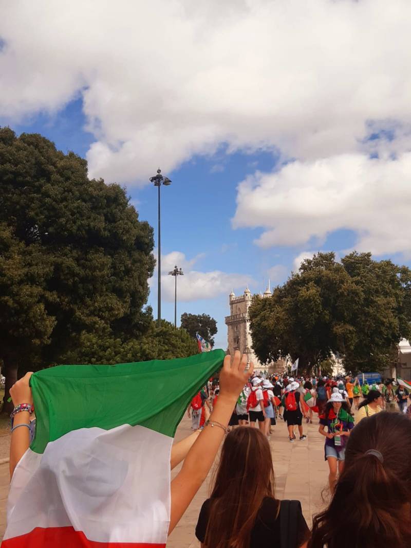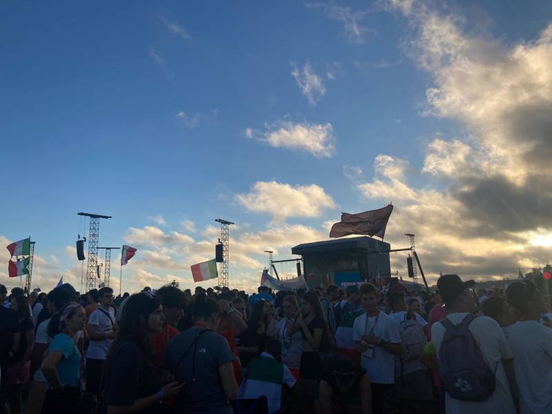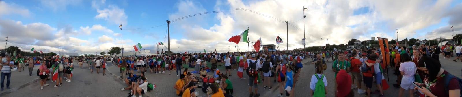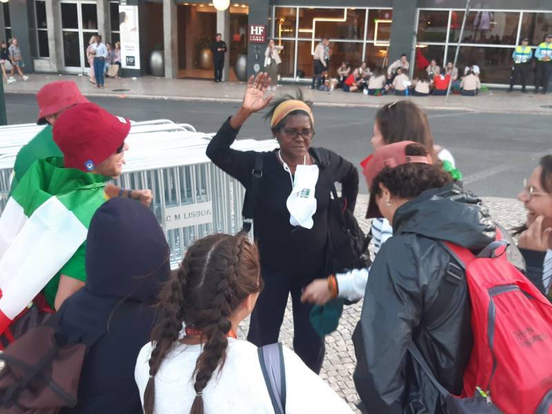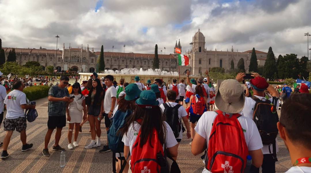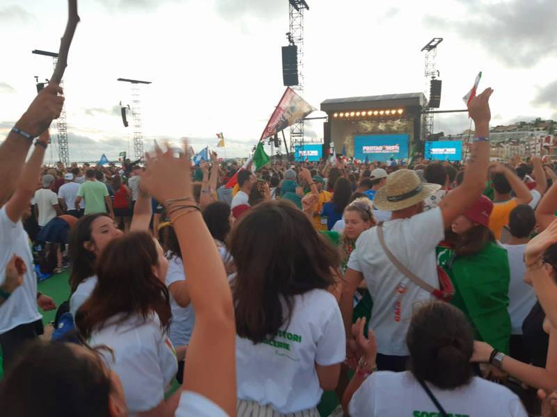 “Due sono i momenti che più ci hanno segnato – proseguono i ragazzi -. La sera di mercoledì 2 agosto abbiamo partecipato alla Festa degli Italiani, organizzata dalla Pastorale Giovanile della CEI insieme a TV2000. Presso il Passeio Marítimo di Algés, ci siamo ritrovati insieme a circa cinquantamila nostri coetanei italiani. È stata una festa/concerto molto bella! Prima abbiamo ricevuto il messaggio di saluto del presidente Mattarella e cantato l’inno di Mameli. Poi abbiamo ascoltato le testimonianze significative di alcuni personaggi celebri, come l’attrice Giusy Buscemi, la pallavolista Cristina Chirichella, lo scrittore ed insegnante Enrico Galiano, il fondatore di Libera don Luigi Ciotti e l’operatore umanitario Gennaro Giudetti, impegnato nella difesa dei diritti umani nelle zone di conflitto. Dopo questi momenti di riflessione, ci siamo scatenati ascoltando anche musica dal vivo, grazie a Fiat 131 e LDA, venuti appositamente per noi in Portogallo. Al termine del concerto, abbiamo ascoltato una riflessione del Card. Matteo Maria Zuppi, presidente della Conferenza Episcopale Italiana, il quale ci ha esortato ad allenarci ad amare Gesù, perché, amando Lui, ameremo anche noi stessi, le nostre fragilità, e anche gli altri. Abbiamo infine concluso la serata con un momento di preghiera, portando sul palco le due effigi sacre che noi ragazzi italiani abbiamo dato in dono alla Chiesa portoghese, ovvero il Crocifisso di San Damiano e l’Icona della Madonna di Loreto. Siamo andati a letto all’una, ma, nonostante la stanchezza, siamo stati veramente felici”.