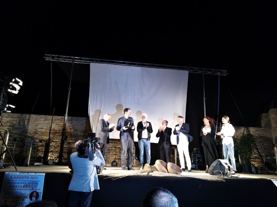 ACQUAVIVA PICENA – Martedì 8 agosto all’interno della Fortezza di Acquaviva Picena l’Associazione Laboratorio Terraviva, presidente cav. Filippo Gaetani, ha organizzato la cerimonia di consegna del premio “Crolla d’oro” a Neri Marcoré, con la seguente motivazione: “Attore, conduttore, imitatore, musicista, cantante, artista dal talento originale e sopraffino con il quale da anni dispensa al vasto pubblico nazionale e oltre, sorrisi e occasioni di crescita all’insegna del buon umore e della cultura. Testimone sensibile, sempre attento, impegnato e coinvolto concretamente nella difesa dei diritti e nelle istanze di solidarietà e sostegno dei più piccoli e dei meno fortunati e nella difesa del Creato e dell’ambiente. Marchigiano autentico, innamorato delle Marche e dei suoi territori chiamati a non arrendersi mai, ma a risorgere e ripartire sempre con rinnovato slancio e vigore. Amico del Laboratorio Terraviva di Acquaviva Picena che con gioia e orgoglio gli conferisce la “Crolla d’oro”, in segno di stima, ammirazione e sincera gratitudine”. Il premio è stato consegnato a Marcorè dall’Amministratore delegato della Linergy, Ezio Parro, sponsor ufficiale della manifestazione. La “crolla” tiene unita tutta la pajarola, manufatto tipico di Acquaviva nel quale i fili di paglia legati insieme danno vita a magnifici lavori, la crolla quindi, viene assegnata a chi ogni giorno cerca di creare e mantenere la condivisione, l’unione e l’aggregazione. Presenti oltre ad un numeroso pubblico e tantissime autorità, anche il presidente della “Lega del filo d’oro” Rossano Bartoli e la mamma di Marcoré, Ines Sabbatinelli. Neri Marcorè e Piero Massimo Macchini hanno fatto trascorrere ai presenti ore di spensieratezza e sano divertimento, entrambi molto preparati e simpatici, sono riusciti a tenere incollati alle sedie il folto pubblico che ha sfidato una serata di forte vento freddo, pur di non perdere nulla del piacevole spettacolo. Sia Marcorè che Macchini hanno riflettuto sulle caratteristiche del “marchigiano” e la risposta è stata che una delle cose che lo contraddistingue dagli altri è proprio il carattere più attento, più avveduto e un ritmo più lento di vita, non che questa lentezza comprometta lo sviluppo, ma certo la storia, le tradizioni e il passato hanno lasciato solchi più profondi nei marchigiani rispetto agli altri. Il cav. Gaetani oltre ad elogiare il lavoro e la maestria delle pajarolare, cioè le donne che realizzano le pajarole, ha elogiato anche tutte le donne dell’Associazione Terraviva, donando a ciascuna un mazzo di fiori, inoltre ha lodato il valore della donna in generale. L’appuntamento è per il prossimo anno.