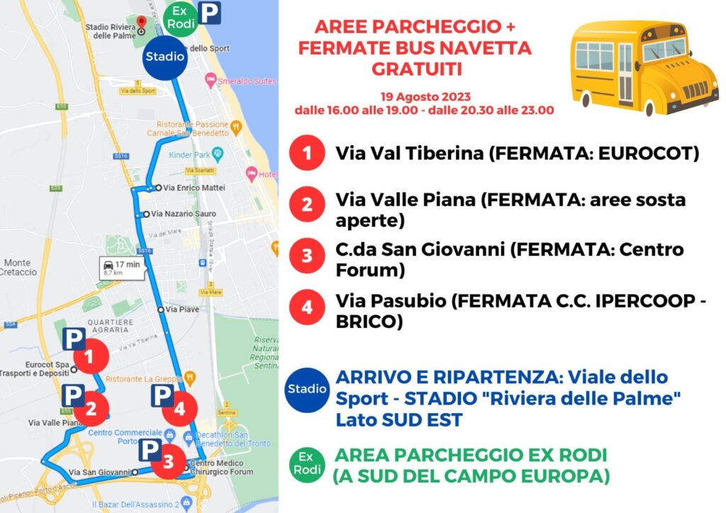 Il 19 agosto, dalle ore 16:00 alle ore 19:00 e dalle ore 20:30 alle ore 23:00, sarà attivo un servizio di bus navetta dedicato con il seguente percorso: Via Val Tiberina (fermata nel parcheggio ex-supermercato EMI – EUROCOT), via Valle Piana (fermata nelle aree di sosta aperte), contrada San Giovanni (fermata al Centro Forum), via Pasubio (fermata centro commerciale Porto Grande e Brico), Via Piave, Via N. Sauro, Via Mattei, Viale dello Sport, Stadio e ritorno.