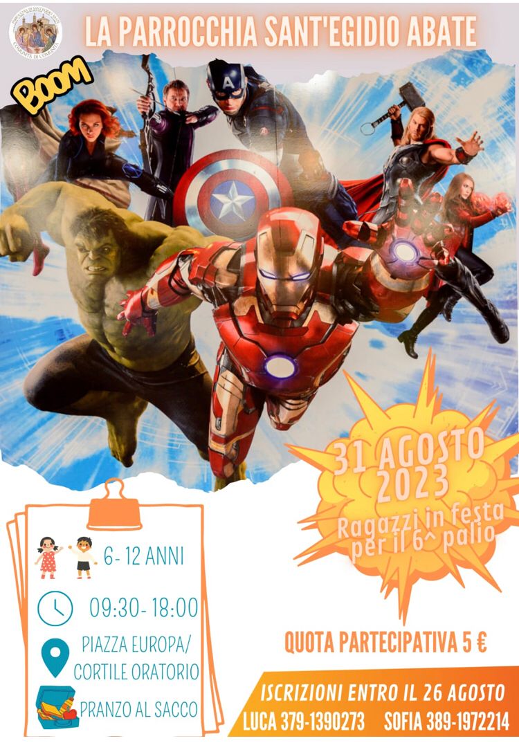 Oggi, giovedì 31 agosto, dopo gli anni della pandemia, i fanciulli e i ragazzi vivranno la VI edizione del Palio di Sant’Egidio. Gli animatori hanno pensato di ambientarlo tra i Supereroi. Da stamattina alle ore 9:30 fino alle 18:00 di stasera i nostri piccoli e giovanissimi parrocchiani vivranno in loro compagnia, ma soprattutto nell’amicizia, nella condivisione del gioco di squadra e della festa in compagnia di Gesù, super supereroe!